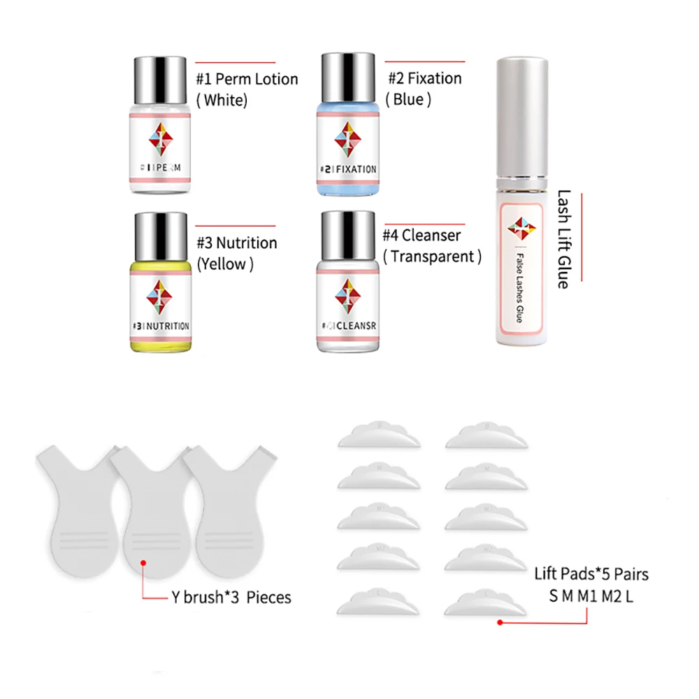 1. Силиконовый стержень: 5 пар (S,M,M1,M2,L)2. 2 пучка y-образных кисти для завивки: 3 шт. 3. Очищающее средство: 1 бутылка4. Перминг агент: 1 бутылка5. Фиксатор: 1 бутылка6. Увлажняющее средство: 1 бутылка7. 5 мл/бутылка ложный клей для ресниц: 1 бутылка