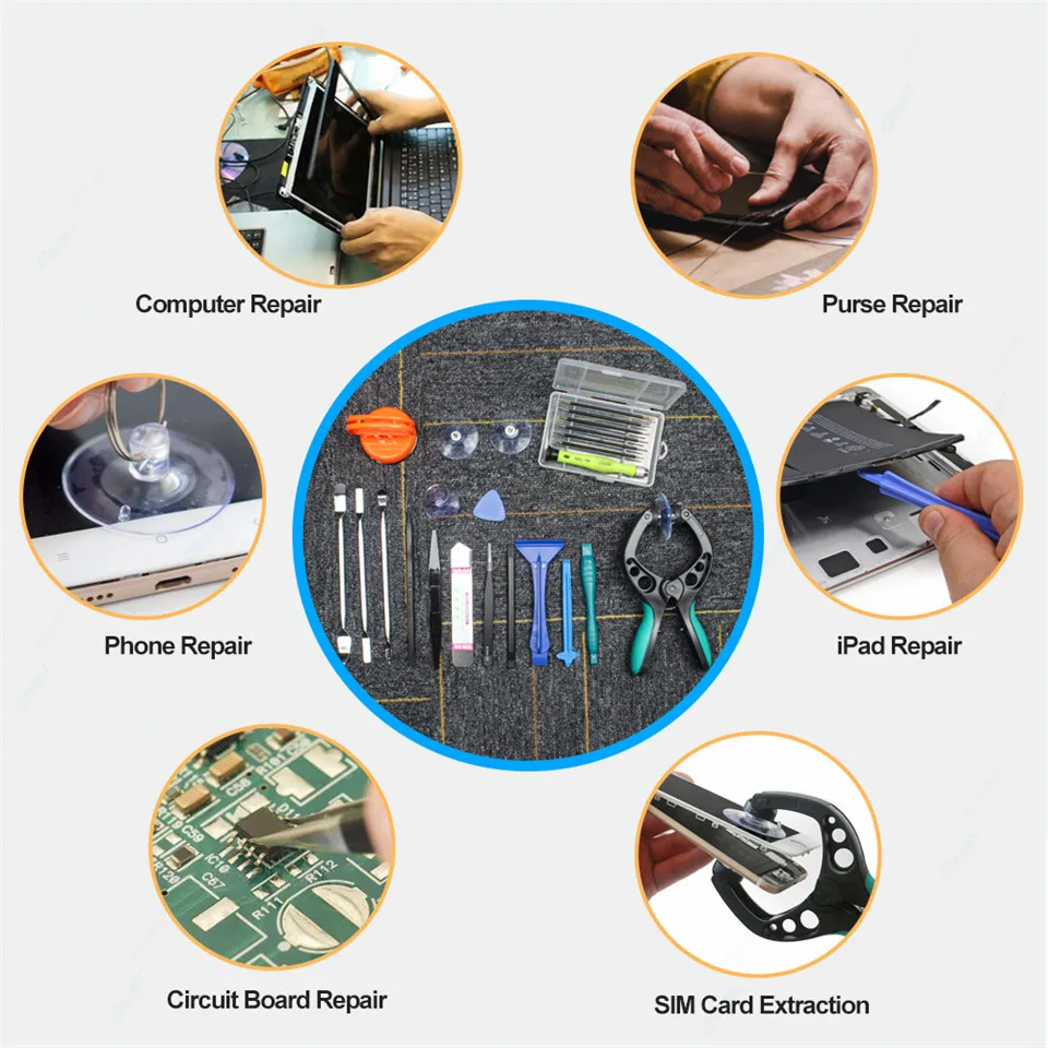 【Открытие ЖК-экрана плоскогубцы присоска 】: плоскогубцы x 1 шт (сменные плоскогубцы присоски x 2 шт), большая присоска x 1 шт., маленькая присоска x 1 шт.Перед тем, как открыть планшетный компьютер, убедитесь, что удалите все винты.Поскольку задняя часть некоторых мобильных телефонов изготовлена из алюминиевого сплава, иногда присоска из ПВХ не работает как обычно. Для использования этих мобильных телефонов, пожалуйста, поместите прозрачную защитную пленку на передний экран.【Набор отверток 】: 7 шт.Ручка отвертки x 1 шт.Три крыла Y-типа 2,0 мм-прямой 2,0 ммPhillips 1,5 мм-прямой 1,5 ммPhillips 1,5 мм-Pentalobe 0,8 ммPhillips 2,0 мм-Pentalobe 1,2 ммT2-T6T4-T5【Хром-ванадиевая сталь с двумя концами лопасти 】: 3 шт.Прочная и долговечная металлическая лопатка с двумя концами. Средняя часть пластика не скользит, что обеспечивает более сильное рулевое управление. Пластиковые инструменты тонкие и гибкие.【 Антистатический пинцет 】: 1 шт.Пинцет изготовлен из металла и пластика. Он имеет острый конец разных размеров и может войти в зазор, что подходит для многих ремонтных работ.【 Антистатический пластиковый прут: 6 шт.Пластиковая зубчатая планка не проводит, может использоваться для удаления материнских плат и ленточных проводов.【Металлический лезвие 】:1 шт.【Треугольный пластиковый рычаг 】:1 шт.Этот пластиковый инструмент для захвата треугольной формы, используйте пластиковый инструмент для открывания треугольника, чтобы легко открыть зажим для крышки телефона, не повредив чехол или телефон. Этот пластиковый захват имеет уникальную форму, которая помогает сделать установку любой сменной детали безопасной и легкой задачей.
