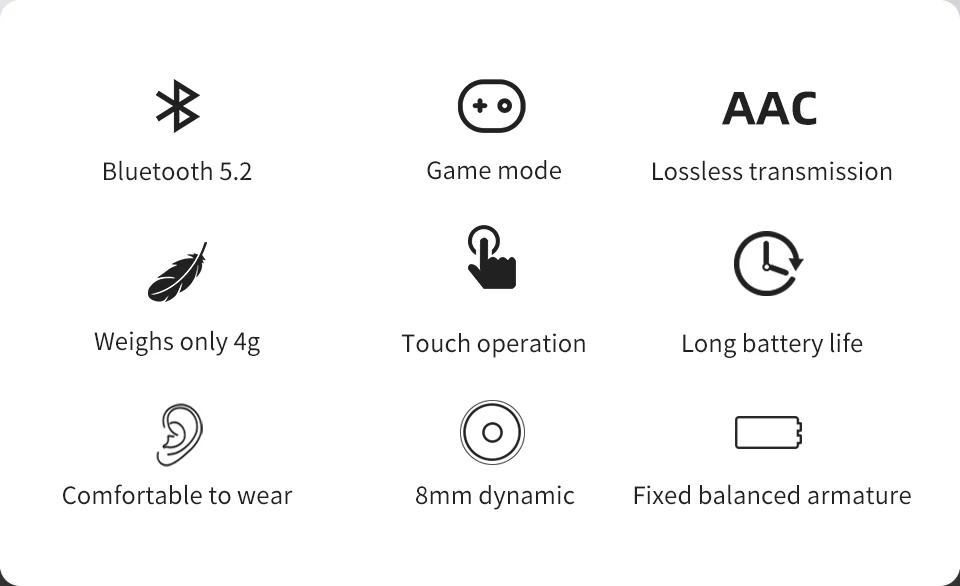 1. Низкое энергопотребление Bluetooth 5,2, быстрая передача, стабильное соединение2. Эксклюзивный идентификационный дизайн, без ощущения легкости, удобно носить в полуушахБольшой динамик 3,8 мм, высококачественное декодирование звука AAC, наслаждайтесь звуком Hi-Fi4. Длительный срок службы батареи, беззаботное путешествие, всегда сопровождается музыкой5. Независимо от основного и вторичного наушников, переключение одного и двойного режимов уха без задержек6. Стандартная беспроводная связь QI, двойной выбор прямой зарядки7. Касание отпечатков пальцев, не нужно нажимать8,15 часов автономной работы, беззаботное путешествие, всегда сопровождается музыкой