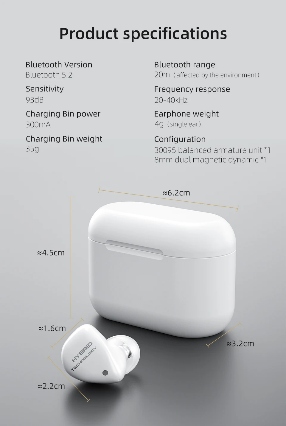 1 пара наушников + 1 зарядный кабель type c + 1 Зарядная коробка + 1 посылка + Руководство пользователяHiFi аудио Bluetooth наушникиПолностью обновленный:1. Новый обновленный чип Bluetooth 5,22. Конфигурация железа класса Hi-FiПодвижная катушка 3,8 мм, максимальный опыт4. Всего 4G, сверхсветильник текстура