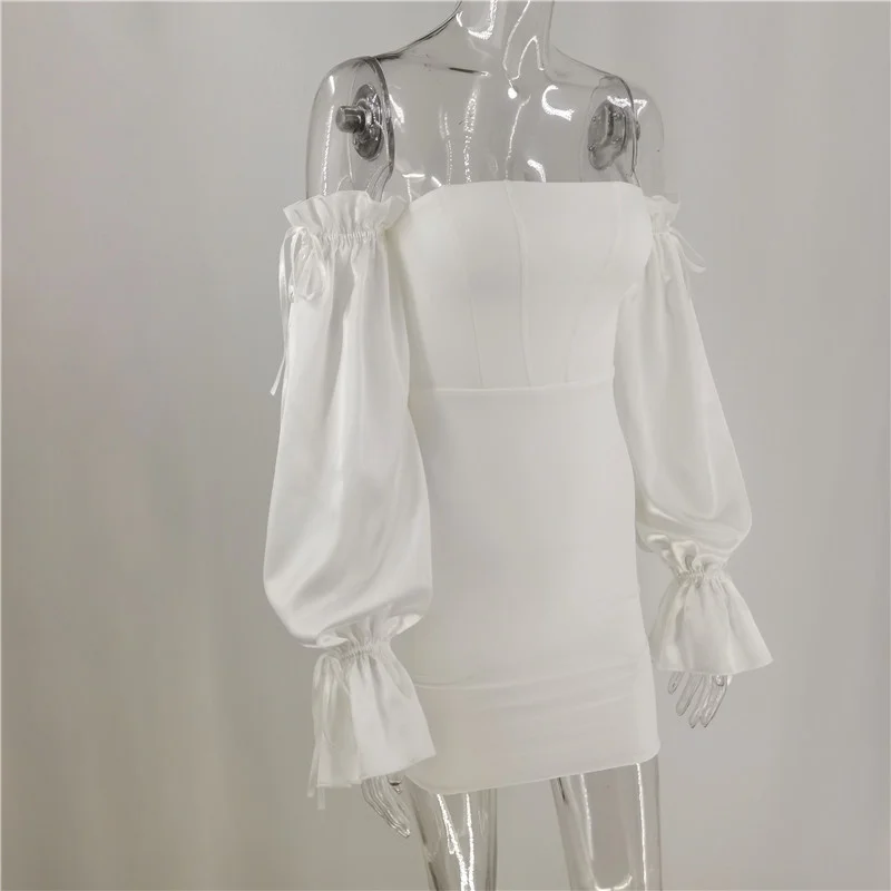 Женское платье, однотонное платье с вырезом лодочкой и длинным пышным рукавом, цельное платье с открытыми плечами для лета, белыйчерный, SMLXL