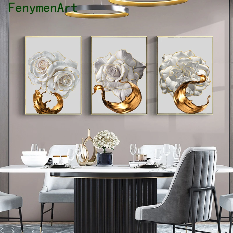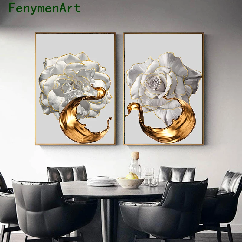 Абстрактная Картина на холсте Белая роза с золотыми чернилами, настенный постер в скандинавском стиле, современная картина с цветами для украшения гостиной