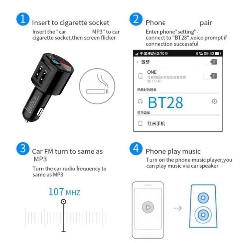 1. Вставьте прикуриватель в гнездо прикуривателя автомобиля, вставьте mp3 bluetooth, а затем включите экран