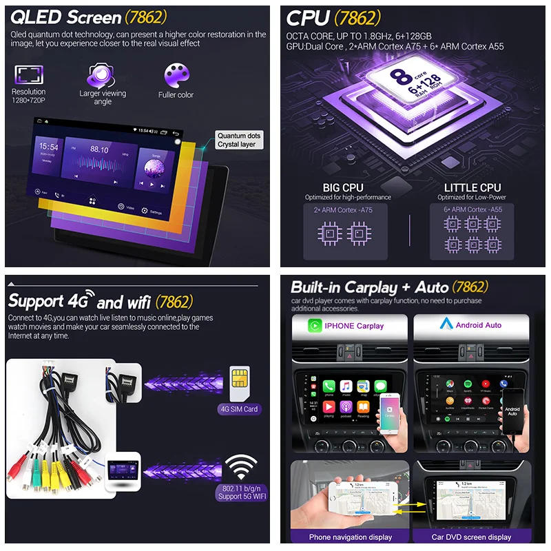 (7862) Поддержка SIM-карты 4G и Wi-Fi, независимо от того, где вы находитесь, вы получите удовольствие от интернет-серфинга, сделайте его возможным для онлайн-навигации/музыки/фильмов и т. Д.