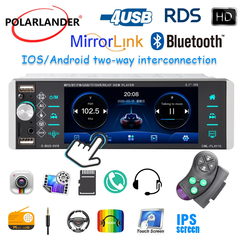 Магнитола Автомобильная 1Din, Mp5 плеер с сенсорным экраном, RDS, AM, FM, 4-USB, 5,1 дюйма, Поддержка Android 10, Mirrorlink, Bluetooth, двунаправленное соединение
