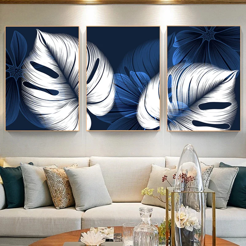 Сине-белые завод плакаты с листьями живопись на холсте Абстрактная живопись Nordic искусство стены декоративные картины для Гостиная украшение дома