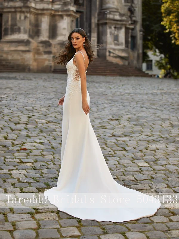 Скромное атласное свадебное платье на бретельках с V-образным вырезом и кружевной аппликацией, эластичное свадебное платье с открытой спиной, 2021