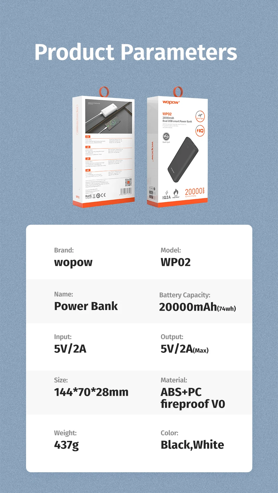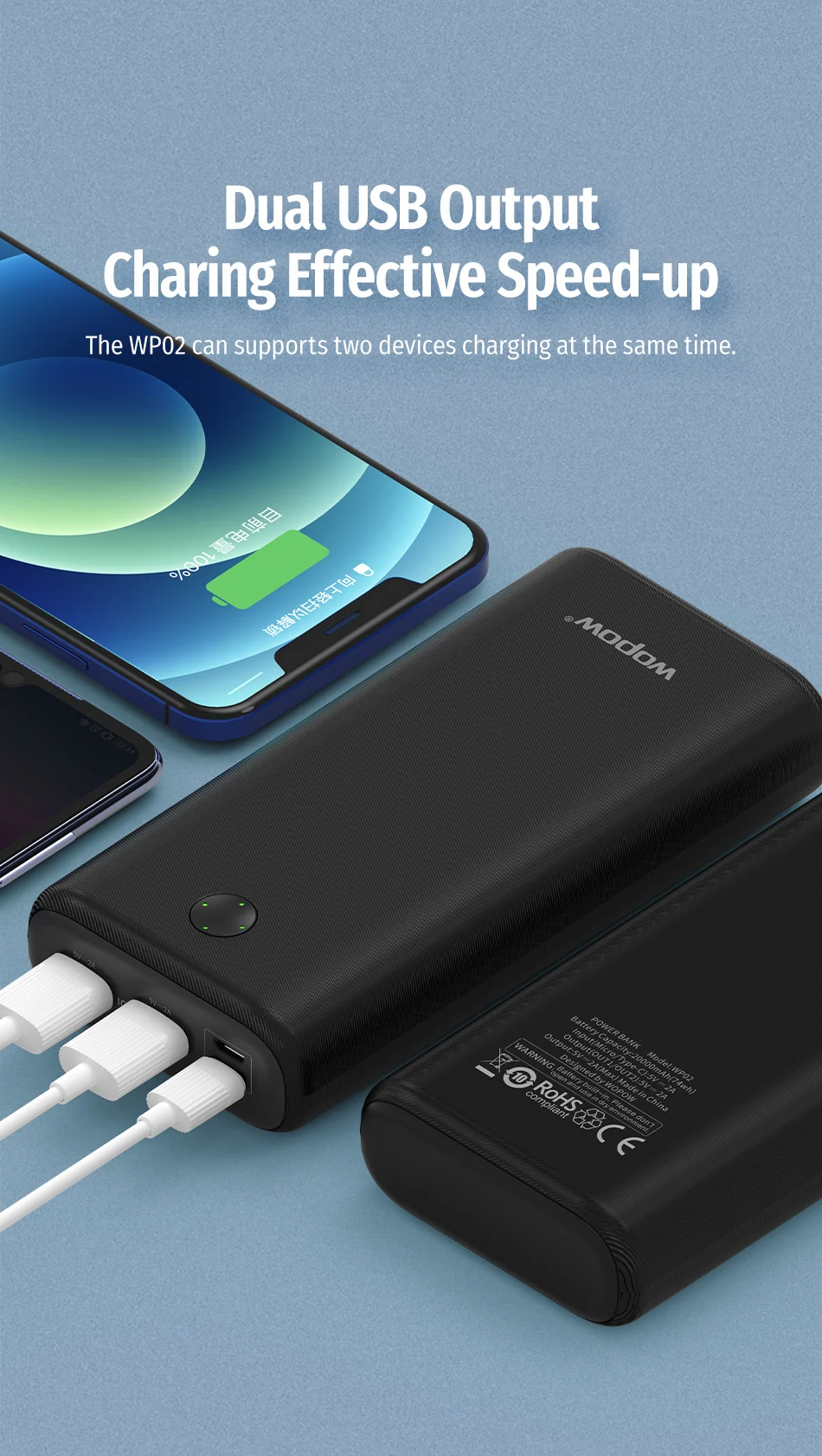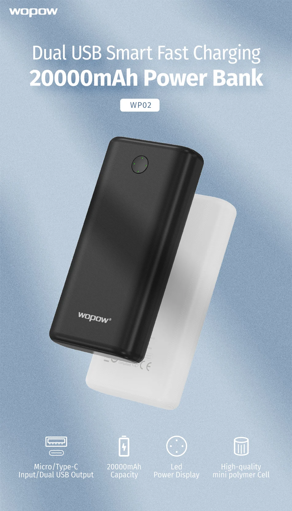 Внешний аккумулятор WOPOWPower, портативное зарядное устройство 5 В, 2 А, 20000 мАч, для Xiaomi, мобильный телефон