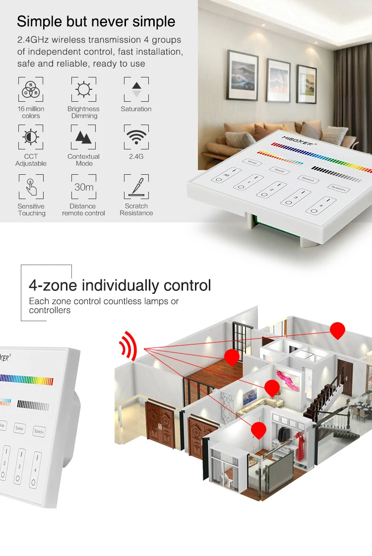 Название продукта: 4 зоны Яркость затемняя Смарт Панель пульт дистанционного управленияНомер модели:В1Рабочая температура: -20 ~ 60 ℃Напряжение: 3 в (2 * AAA батареи)(Аккумулятор в комплект не входит)Частота передачи: 2400-2483,5 МГцМетод модуляции: GFSKМощность передачи: 6 дБмРасстояние управления: 30 мМощность в режиме ожидания: 20uAРазмер панели: 86*86*19 ммНазвание продукта: 4-Зона CCT Регулировка Смарт ПанельНомер модели:В2Рабочая температура: -20 -60 ℃Напряжение: 3 в (2 * AAA батареи)(Аккумулятор в комплект не входит)Частота передачи: 2400-2483,5 МГцМетод модуляции: GFSKМощность передачи: 6 дБмРасстояние управления: 30 мМощность в режиме ожидания: 20uAРазмер панели: 86*86*19 ммНазвание продукта: 4-зона, RGBW смарт Панель пульт дистанционного управленияНомер модели:В3Рабочая температура: -20 -60 ℃Напряжение: 3 в (2 * AAA батареи)(Аккумулятор в комплект не входит)Частота передачи: 2400-2483,5 МГцМетод модуляции: GFSKМощность передачи: 6 дБмРасстояние управления: 30 мМощность в режиме ожидания: 20uAРазмер панели: 86*86*19 ммНазвание продукта: 4 зоны RGB + CCT Smart Панель пульт дистанционного управленияНомер модели:В4Рабочая температура: -20 -60 ℃Напряжение: 3 в (2 * AAA батареи)(Аккумулятор в комплект не входит)Частота передачи: 2400-2483,5 МГцМетод модуляции: GFSKМощность передачи: 6 дБмРасстояние управления: 30 мМощность в режиме ожидания: 20uAРазмер панели: 86*86*19 ммРазмер B1 / B2 / B3 / B4