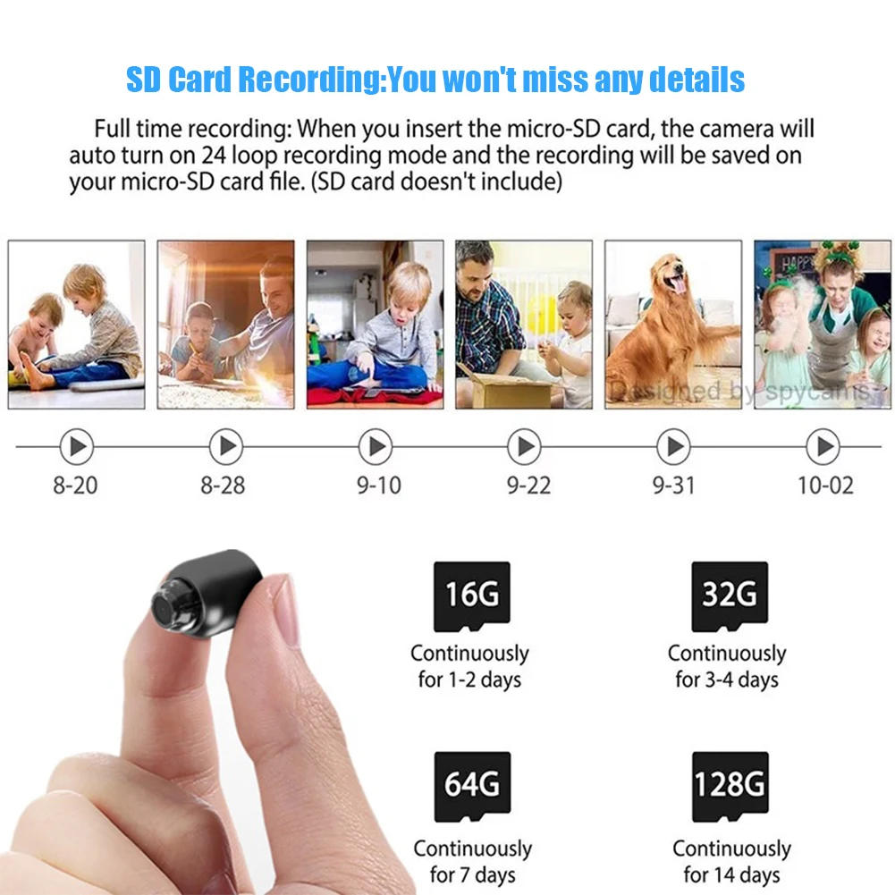 Эта мини-камера использует обнаружение движения, камера начнет запись после обнаружения движущегося объекта, и Карта памяти может быть перезаписана в циклах, когда карта памяти заполнена.