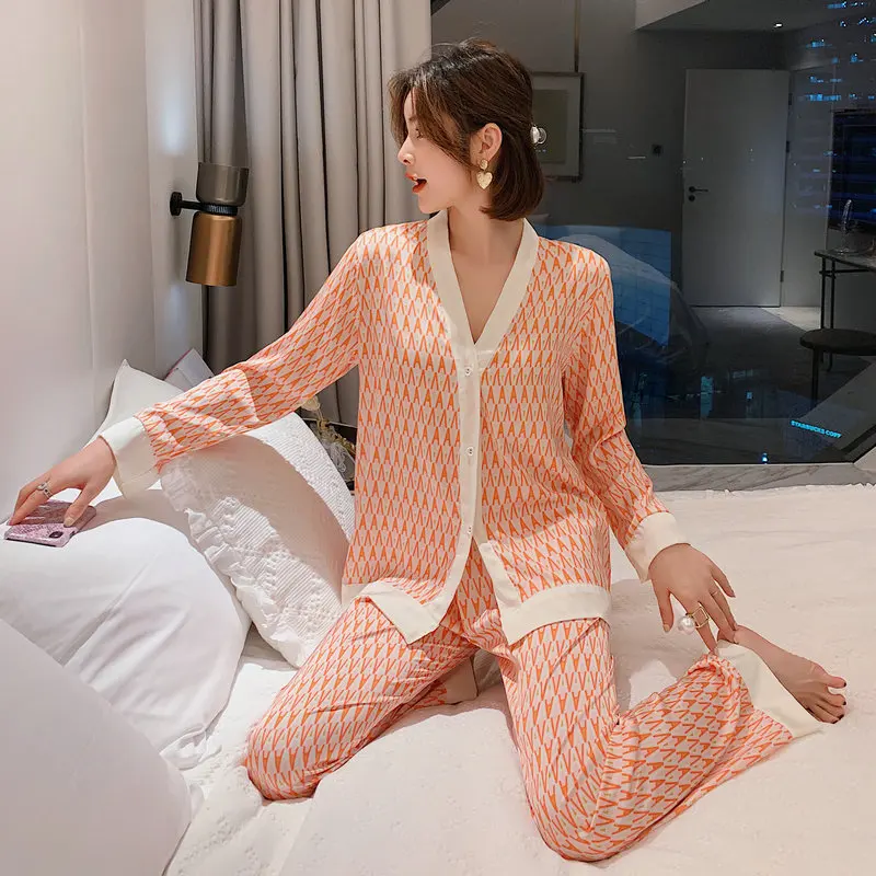 Пижама женская шелковая, с V-образным вырезом и длинным рукавом