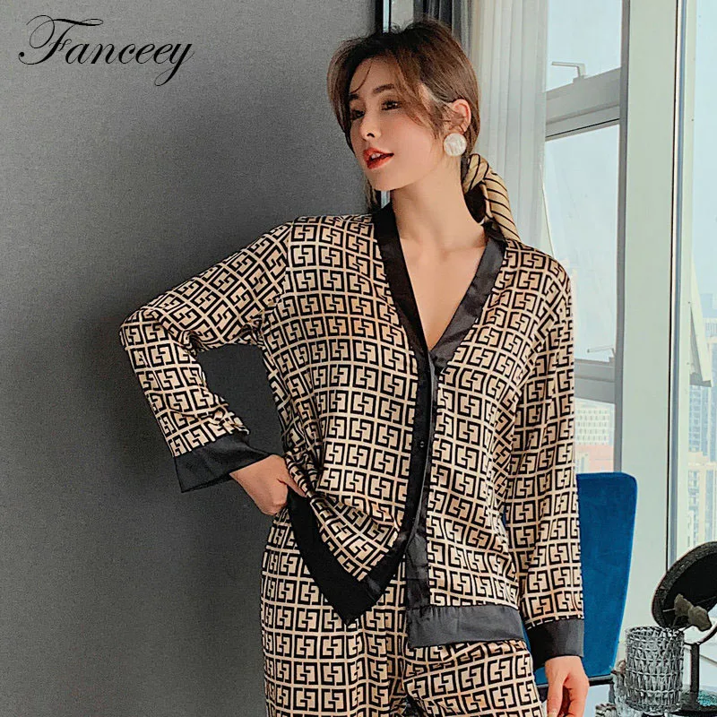 Женский пижамный комплект Fanceey, комплект нижнего белья в роскошном стиле, пижамы с принтом букв, Шелковый, повседневный домашний костюм, ночная рубашка, 2021