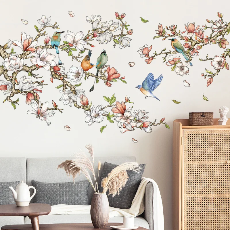 Настенные Стикеры с большими цветами и птицами, украшение для спальни, Фоновые наклейки для гостиной, фона за телевизором, наклейки на стену, обои с магнолией
