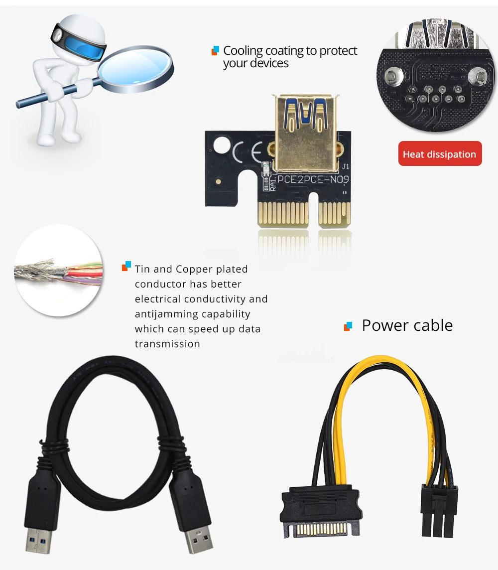 100 шт., Райзер-карта VER009 Plus usb 3.0 PCI-E, Райзер-адаптер Ver 009s Express 1X 4x 8x 16x SATA, 15pin-6 pin, адаптер майнера BTC