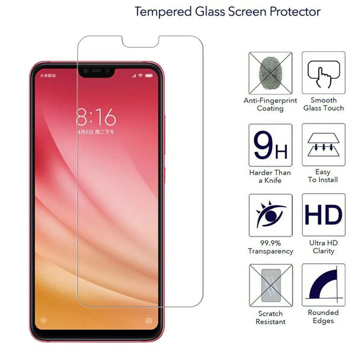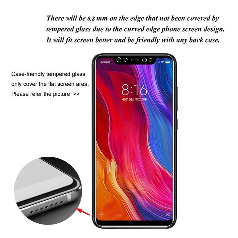 Дизайн меньше, чем экран телефона по краям, закрывает только плоскую область дисплея, чтобы соответствовать всем чехлам.