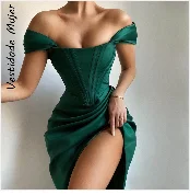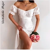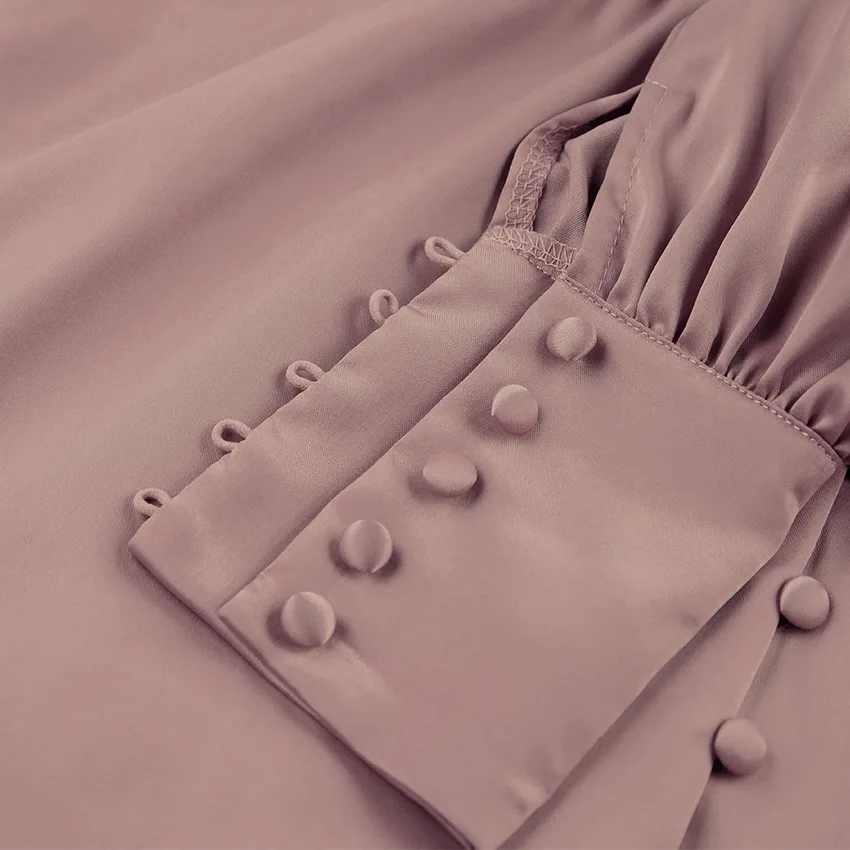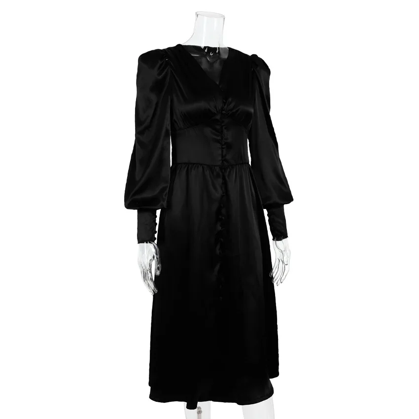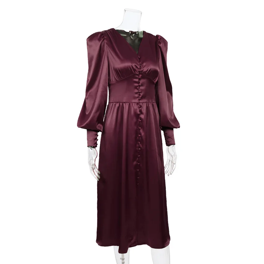 Женское однобортное атласное платье миди VestidosMujer, бежевое элегантное праздвечерние чное платье с высокой талией, V-образным вырезом и рукавами-фонариками