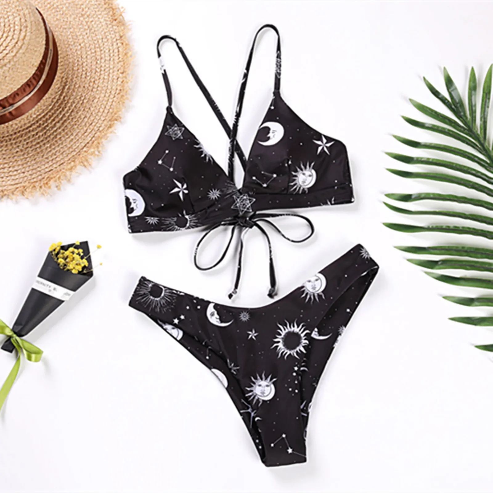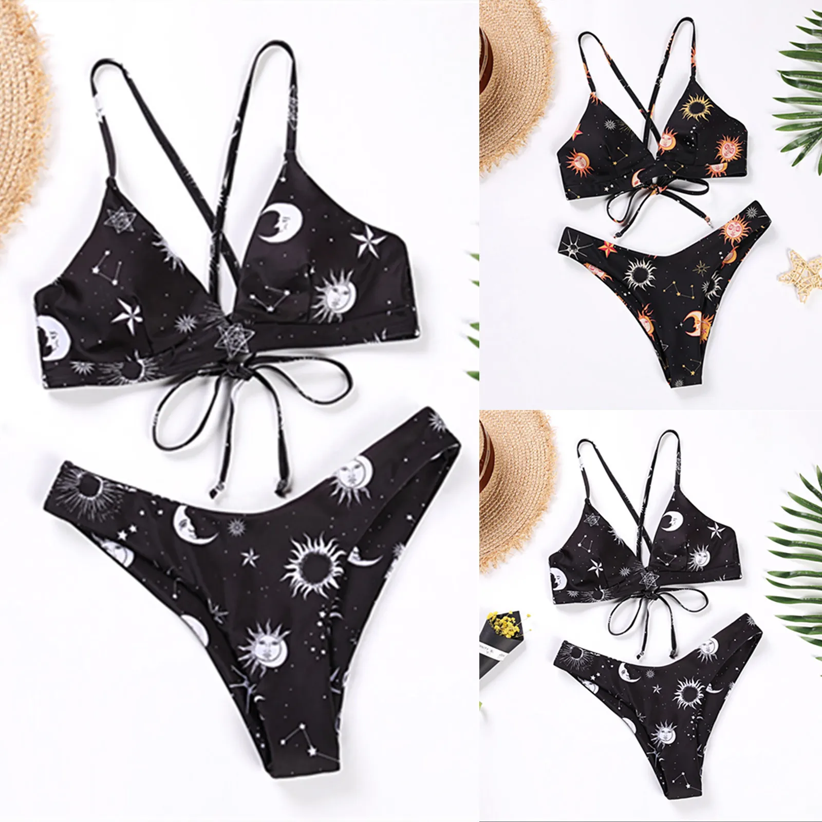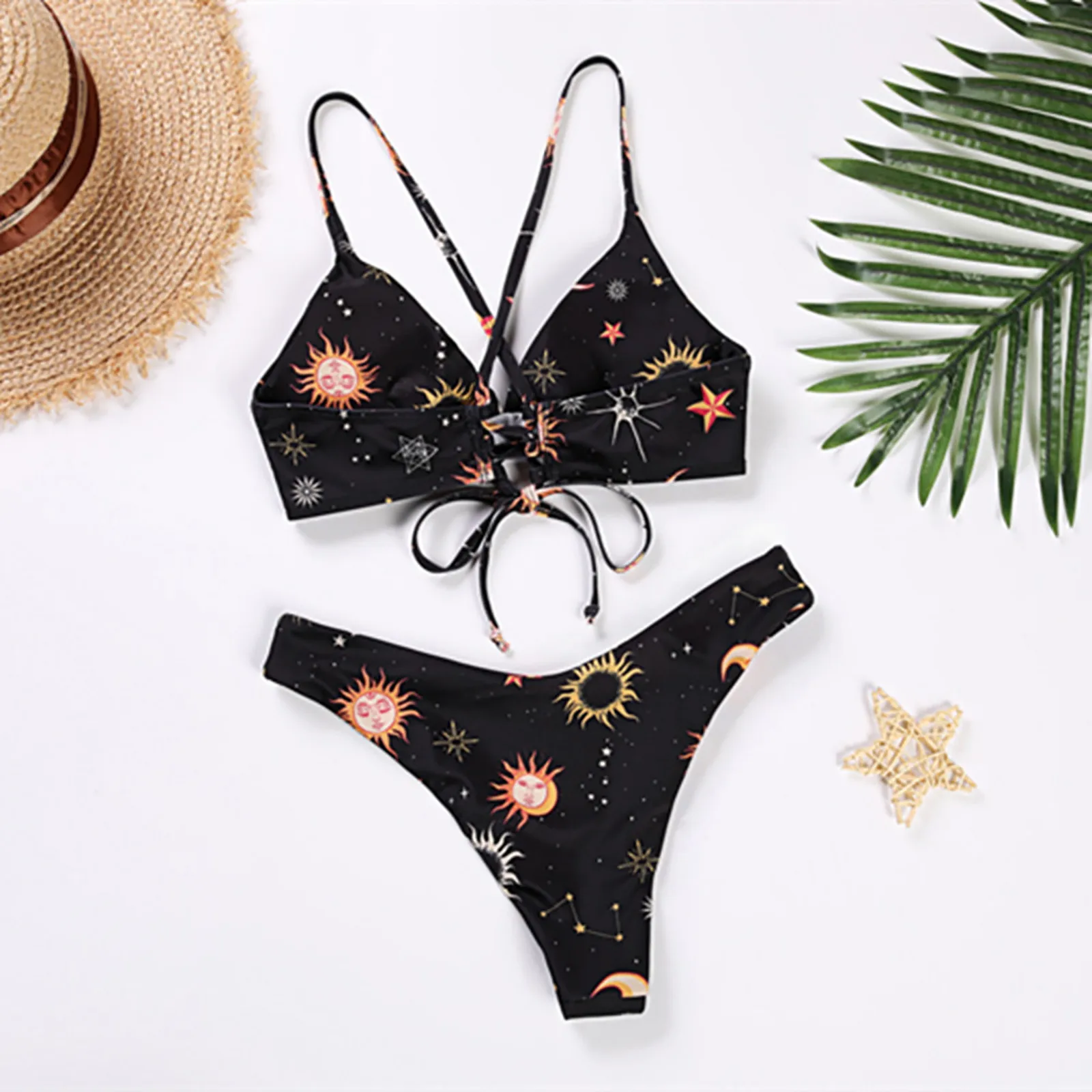 Сексуальное Бандажное Бразильское бикини комплект Для женщин в стиле ретро с изображением солнца, луны, с рисунком, пуш-ап, Разделение купальный костюм из двух предметов летние пляжные купальные костюмы