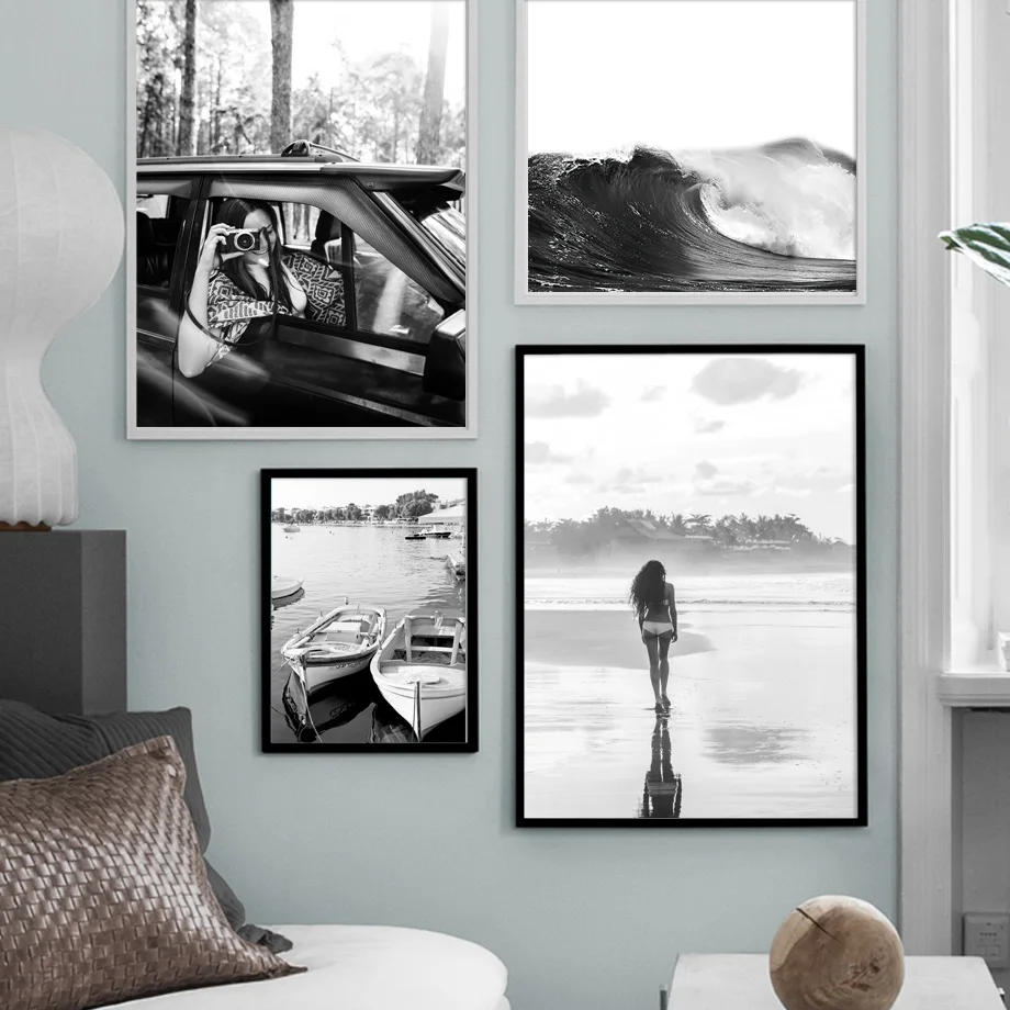 Черно-белые волнистые пляжные доски для серфинга для девочек, лодка с пальмовым деревом, скандинавский постер, настенный художественный принт, холст, картина, Декор, картина для гостиной