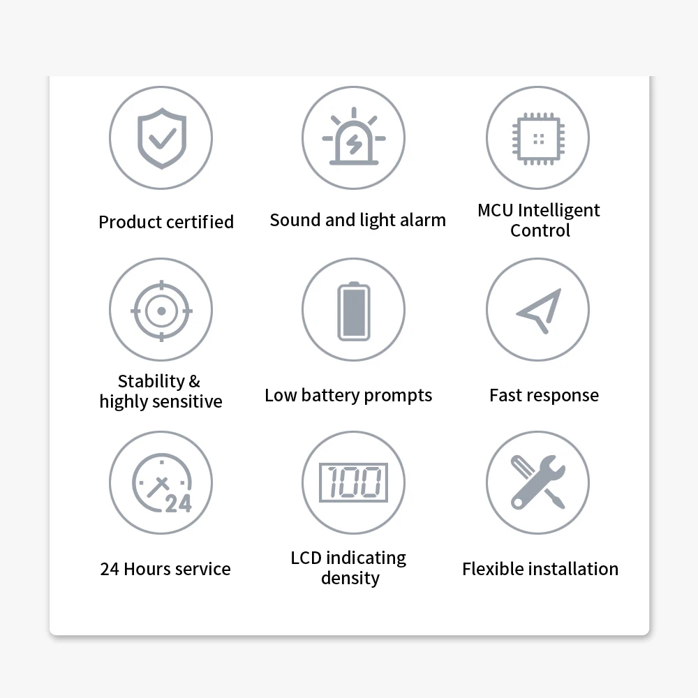 1. Уникальный цифровой ЖК-экран, чтобы показать низкие уровни CO 2. Неисправное предупреждение. 3. Предупреждение о низком заряде батареи. 4. Большая кнопка тестирования для удобства эксплуатации. 5. Записывает Пиковые уровни CO, обнаруженные в течение 4 недель 6. Встроенный индикатор комнатной температуры с диапазоном + 2 градуса 7. Большая кнопка проверки и тишины 8. Легко установить-отдельно стоящий или настенный 9. Чувствительность сигнала тревоги/ответ: соответствует стандарту EN 50291:2010