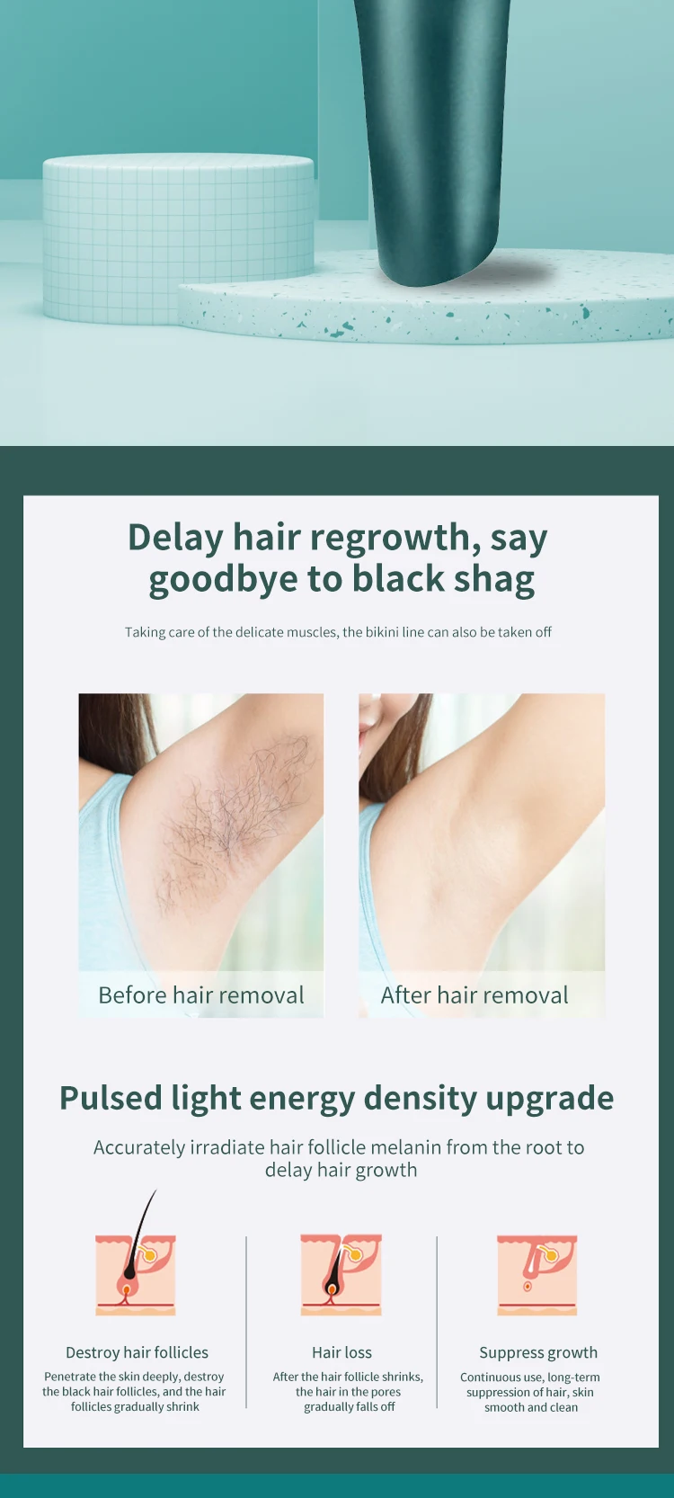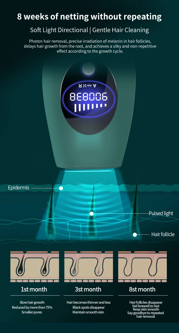 Время удаления волос: 900000 разАксессуары: адаптер + хост + руководство на китайском/английском языкахОдин вес: 0,6 кгОтличная производительность1. 900000 раз вспышки, ЖК-дисплей2. Поддержка ручного и автоматического двойного режима3. Поддержка 8-скоростной регулировки энергииТройная защита безопасности1. Встроенный чип датчика безопасности.2. Универсальное устройство, предотвращающее босветильник и множественное повреждение при установке и удалении3. Множественная защита материнской платы для обеспечения стабильной работы.Концепция очеловеченного дизайна1. Линзы с многослойным покрытием с широким охватом и большей эффективностью.(1-3 шага удаления волос для улучшения текстуры кожи, 1-8 шагов: удаление волос)2. Размер и внешний вид мини легче носить с собой, и им легко управлять, держа форму.3. Параметры большого экрана легче читать.Инструкции:1) сначала Подключите питание и включите устройство; Выберите шестерню; Для первого использования рекомендуется медленно начинать с низкой передачи до соответствующей передачи.2) поместите лазерную головку на кожу, после того, как индикатор замигает, нажмите кнопку запуска, чтобы завершить операцию; Перейдите к следующей части и продолжите работу.3) после включения машины; Короткое нажатие кнопки излучения для работы с излучением света, долгое нажатие кнопки излучения для автоматического/ручного переключения режима излучения светильник.
