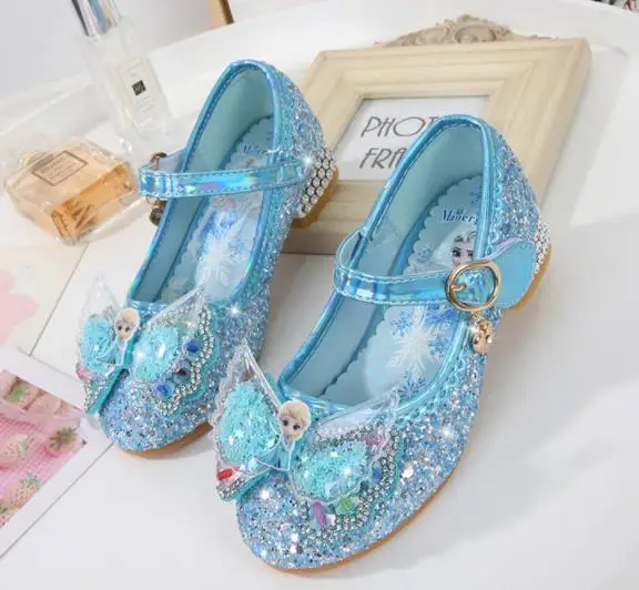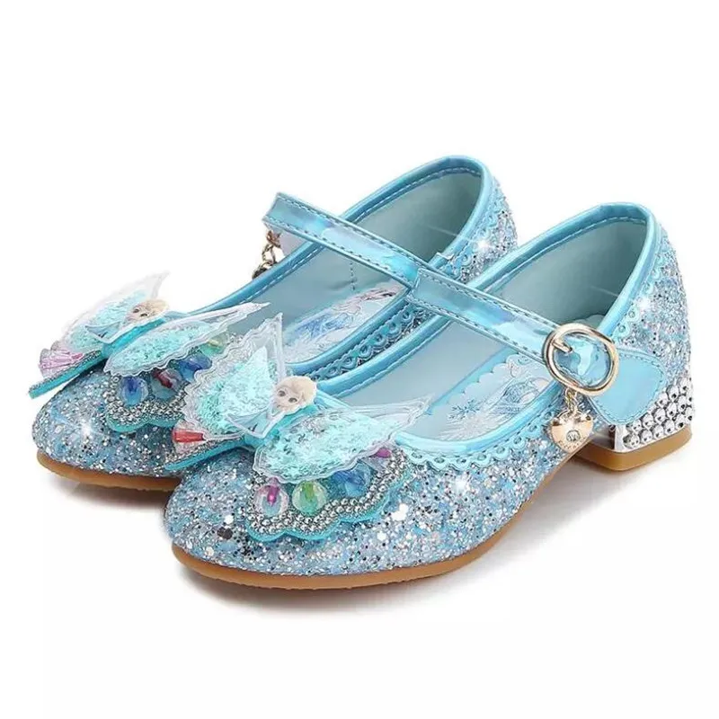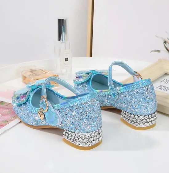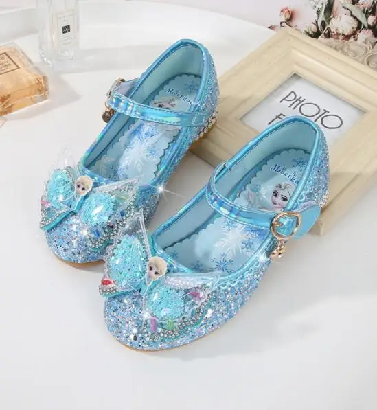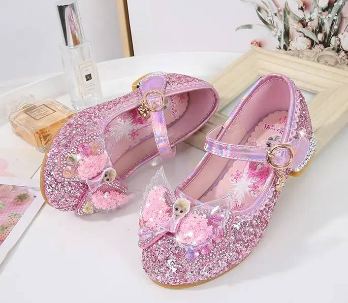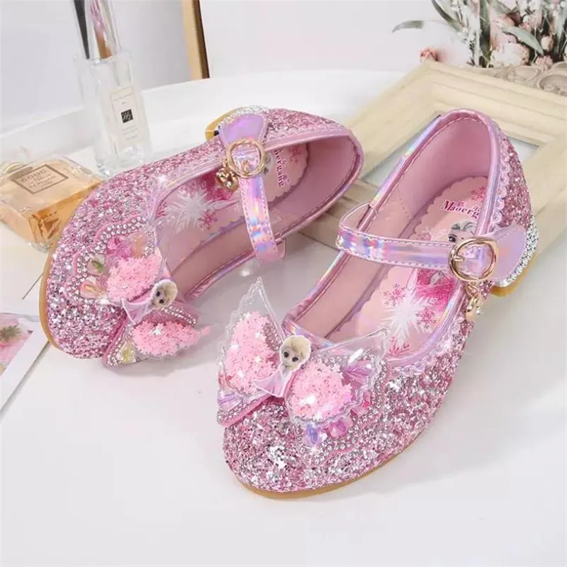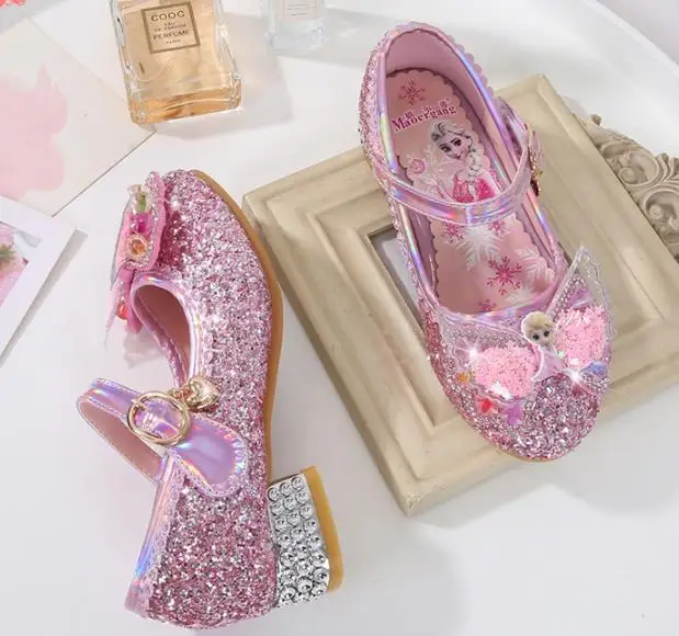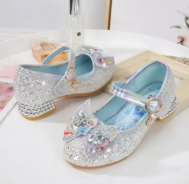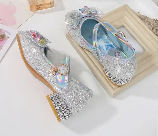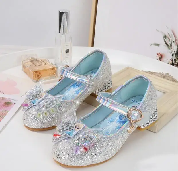 Свадебные туфли для девочек, блестящие новые модные брендовые сандалии принцессы Эльзы на каблуках, детские танцевальные туфли с бантом для детских вечеринок