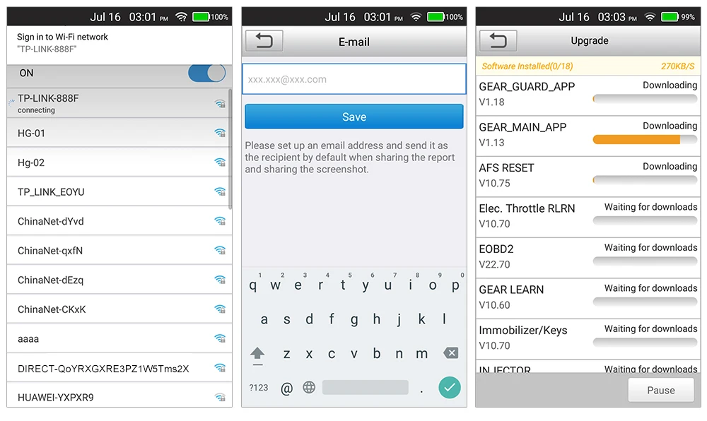 1. Входной почтовый ящик активирует машину и подключается к сети wifi перед обновлением работы2. Если новое программное обеспечение или АПК могут быть обновлены, цифровой индикатор будет отображаться на 'Upgrade'module в меню работы. В этом случае вы можете использовать эту функцию, чтобы синхронизировать ее с последней версией.3. Нажмите «Обновить» в меню «работа», чтобы войти в центр обновления. По умолчанию выбрано все диагностическое программное обеспечение.4. Чтобы снять выбор определенного программного обеспечения, коснитесь "отменить выбор", а затем установите флажок рядом с моделью транспортного средства.5. Коснитесь обновления, чтобы начать загрузку. Это может занять несколько минут, чтобы закончить его, пожалуйста, будьте терпеливы, чтобы ждать. Чтобы приостановить загрузку, коснитесь стоп. Чтобы продолжить работу, коснитесь продолжить. Если сбой сетевого подключения происходит, коснитесь повторной попытку, чтобы повторить попытку.6. После завершения загрузки пакеты программного обеспечения будут установлены автоматически.