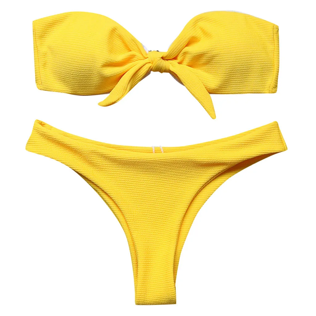 Женский купальник-бикини, 2021 сексуальный однотонный топ с бантом и высоким вырезом, комплект бикини из двух предметов, женский купальный костюм