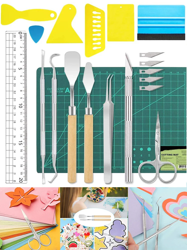 2 x крючок для чистки, 1 x пинцет, 1 x ножницы из нержавеющей стали, 2 x нож для живописи маслом, 1 x нож для резьбы, 5 x лезвия, 5 x Размер скребковой доски, 1 x линейка, 1 x тонкий треугольник, 1 x A5 коврик для резки;