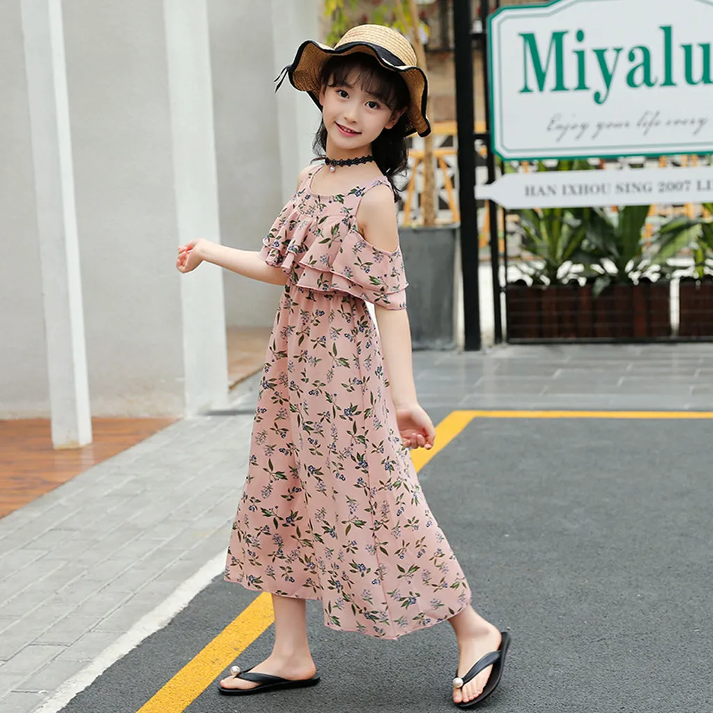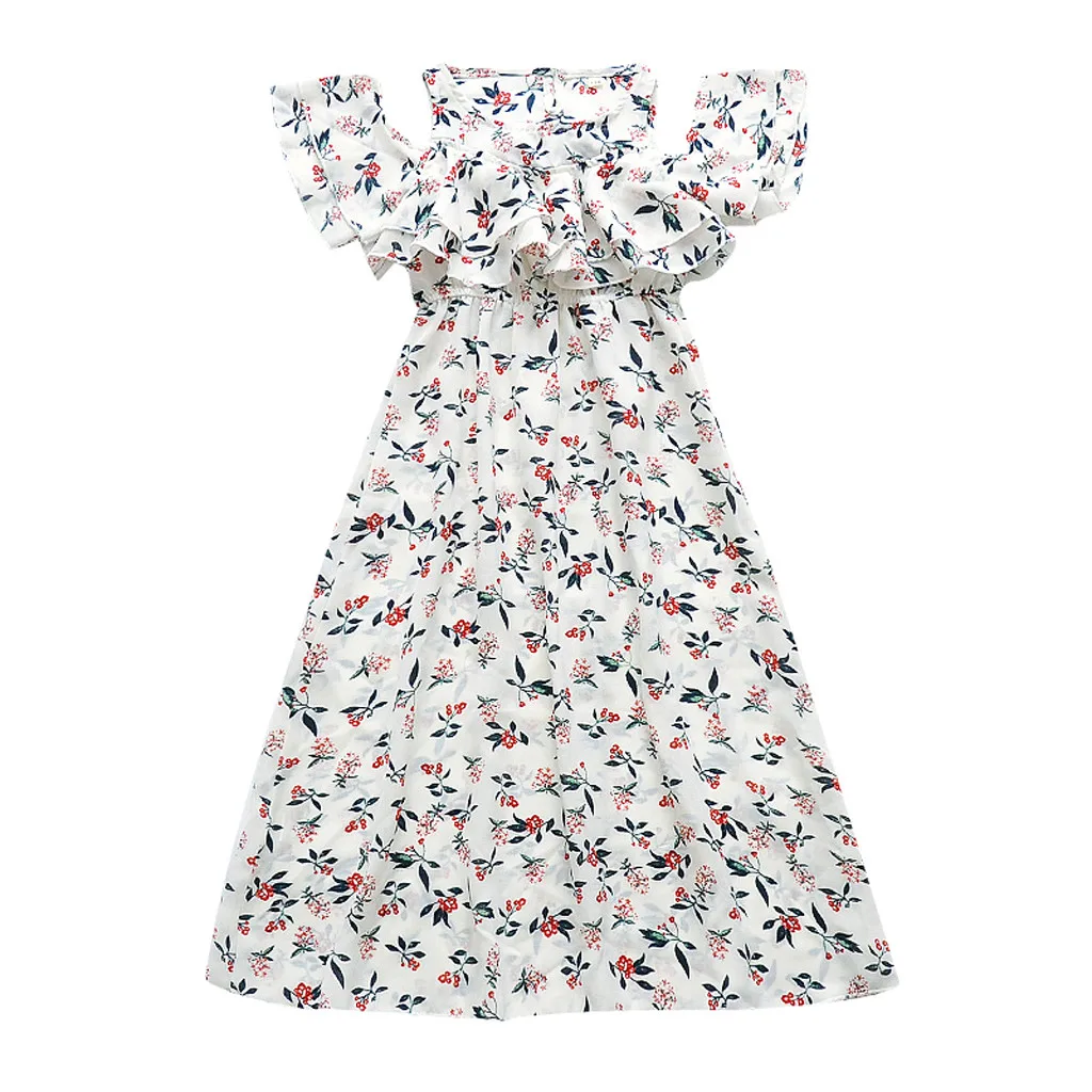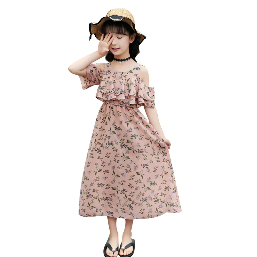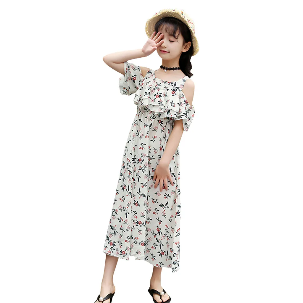 Детское пляжное платье с открытыми плечами и оборками для девочек-подростков; Повседневная одежда
