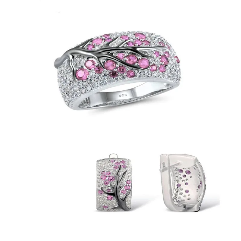 Новинка, блестящие серьги в виде цветка, ветки вишни, набор колец с красным кубическим цирконием, украшения в подарок
