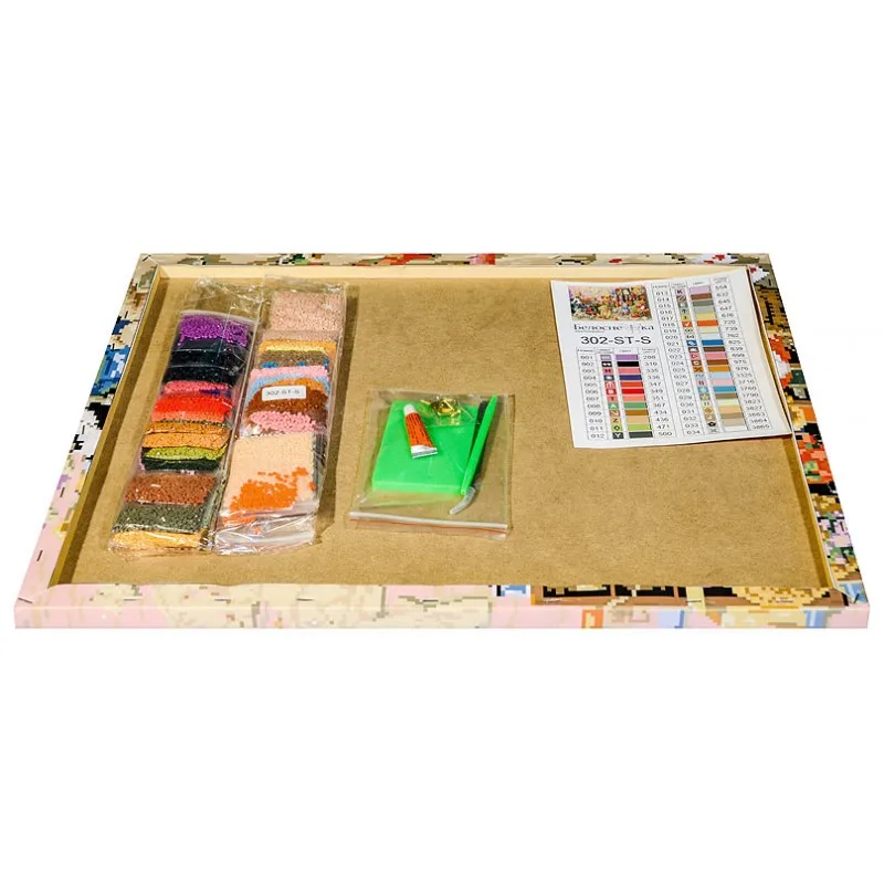 Комплектация:1. Основа картины - холст с нанесенной схемой на подрамнике2. Комплект квадратных камней с огранкой 2,5*2,5 мм.3. Пластмассовый лоток с ячейками4. Пинцет металлический5. Крепления для подвеса на стену6. Жидкий клей7. Листовка-ключ к схеме