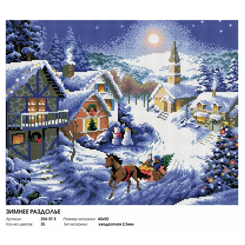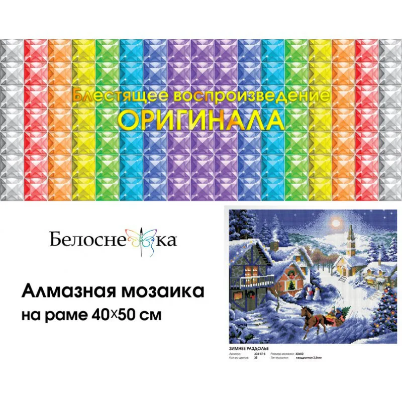 Характеристики:Серия - зимний пейзажТип выкладки – 100% заполнениеФорма камней - квадратные 2,5*2,5 мм, 9 и 13 гранейРазмер – 40*50 см.Количество цветов - 35Упаковка – картонная коробкаТорговая марка – БелоснежкаСтрана производства - Китай