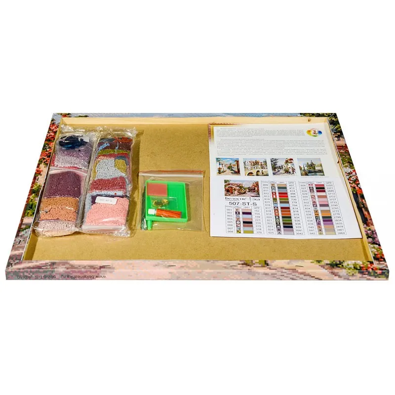 Комплектация:1. Основа картины - холст с нанесенной схемой на подрамнике2. Комплект квадратных камней с огранкой 2,5*2,5 мм.3. Пластмассовый лоток с ячейками4. Пинцет металлический5. Крепления для подвеса на стену6. Дополнительный тюбик клея7. Листовка-ключ к схеме 8. Листовка о художнике