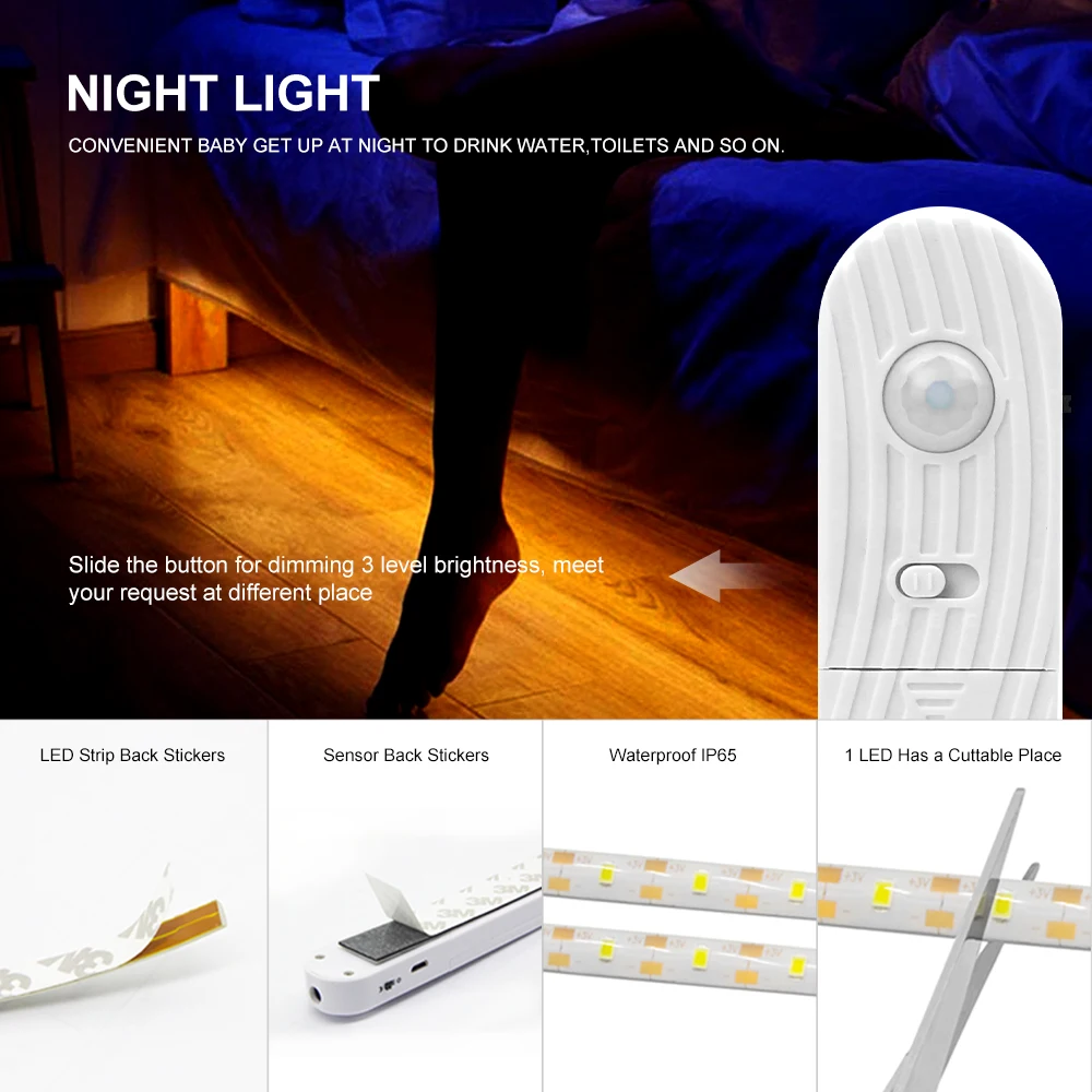 Светодиодный светильник с датчиком движения для шкафа под кроватью, лестницы, шкаф, лампа, лента, водонепроницаемая, 5 В, 1 м, 2 м, 3 м, USB светодиодный шкафНочной светильник