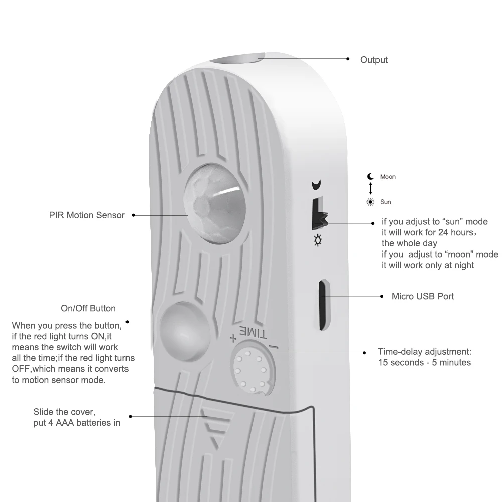 【Двойной источник питания и регулировка задержки времени с портом micro USB, он может питаться от USB кабеля (не входит в комплект) напрямую, более экономный или 4 батарейки AAA (не входят в комплект), более удобный. И есть кнопка задержки времени, вы можете настроить светильник на время от 15 секунд до 5 минут задержки.