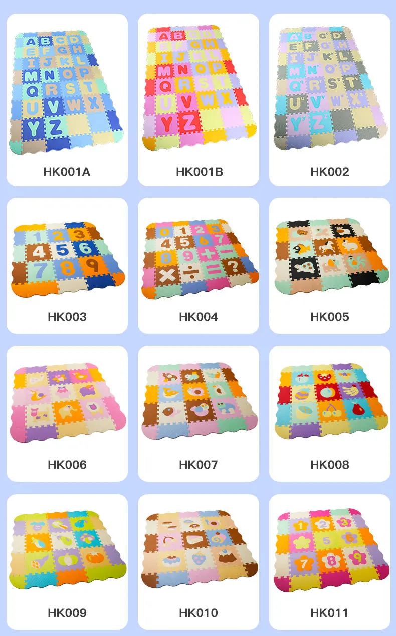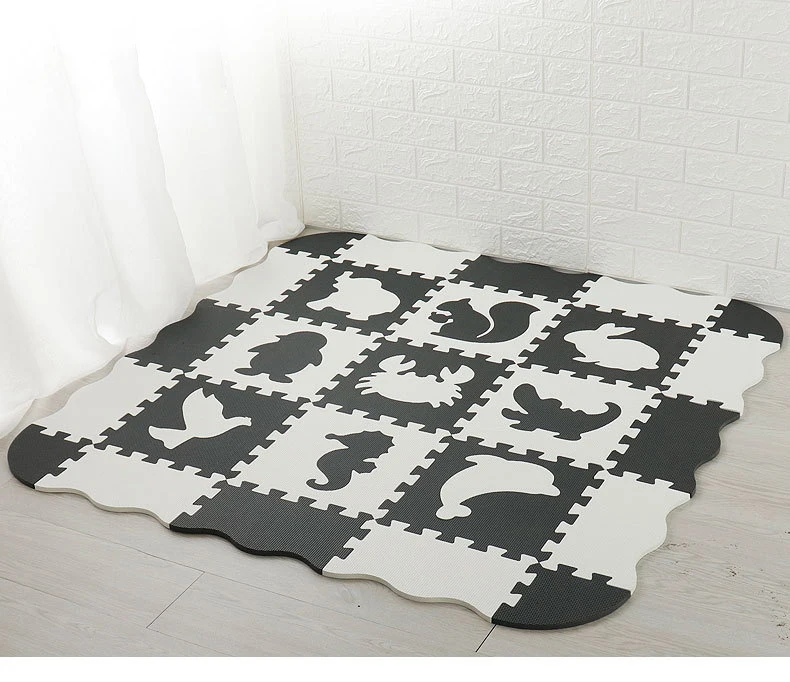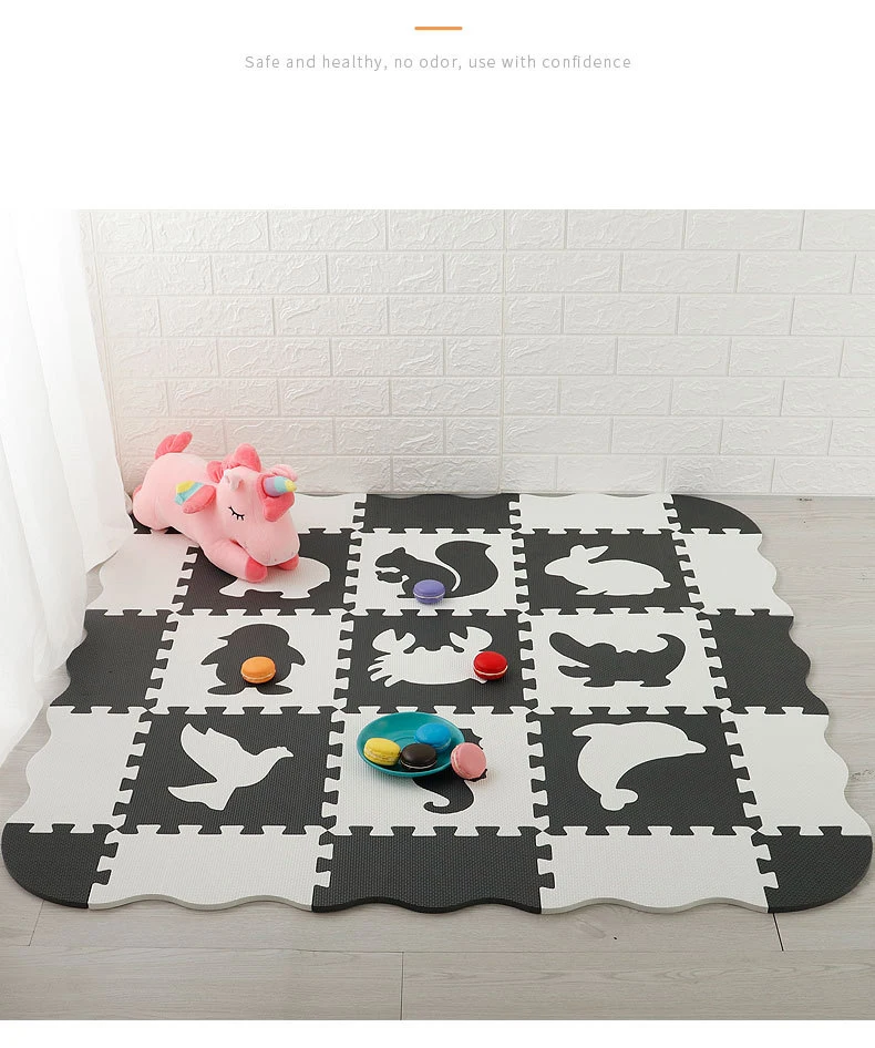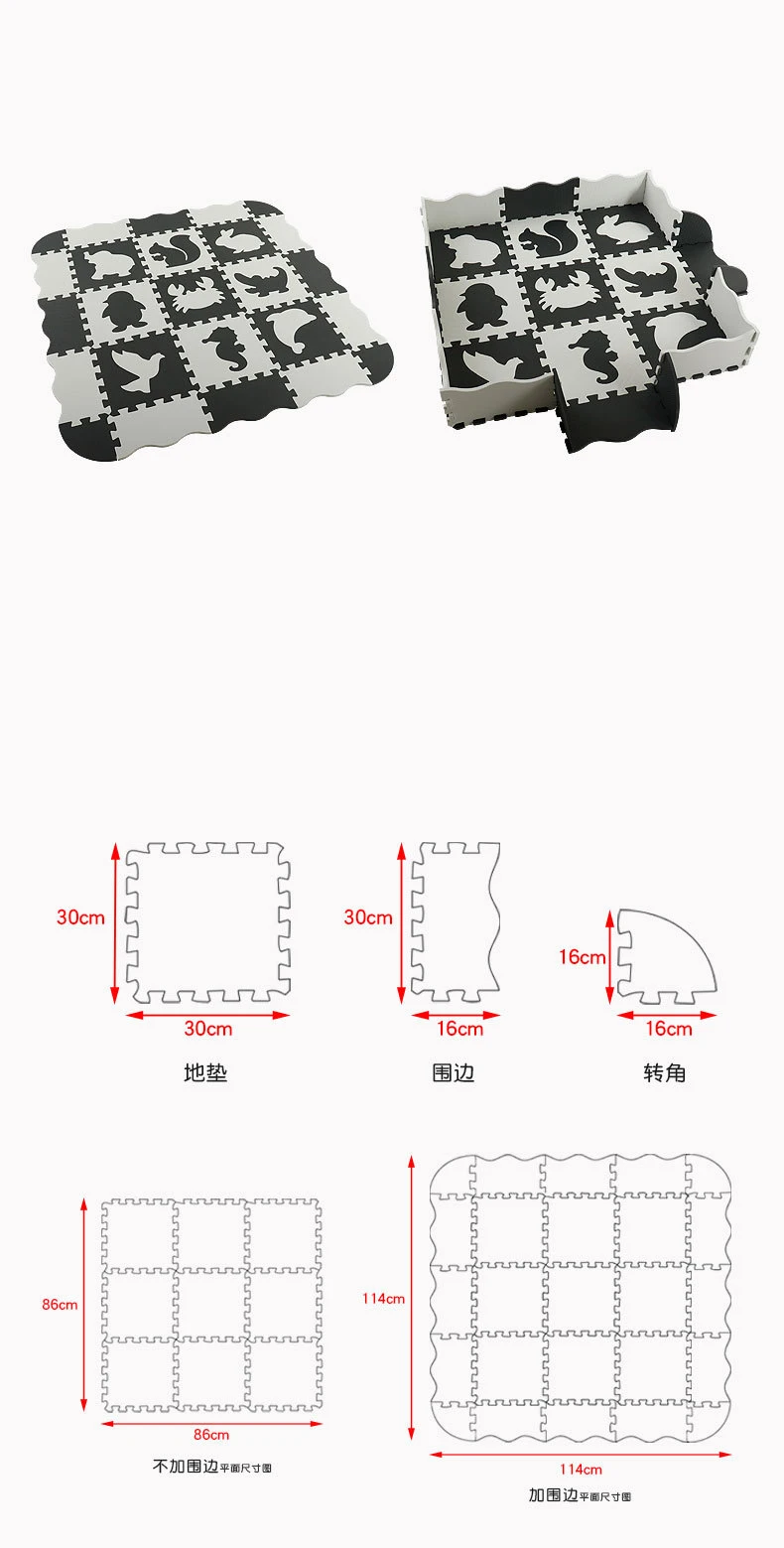 Название: напольный материал: EVA материал для защиты окружающей среды Размер: 30*30*1 см (один предмет) подходящий возраст: ребенок старше 3 месяцев упаковка: Экологически чистая термоусадочная пленка Размер упаковки: 30*30*16 см В комплект входит: 9 шт. ковриков + 12 шт. круглых краев + 4 шт. Вес изделия: 1 кг