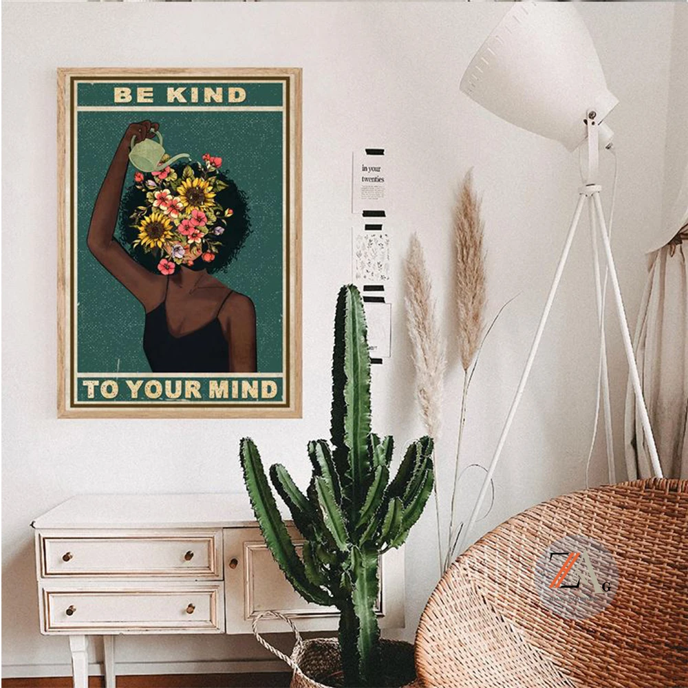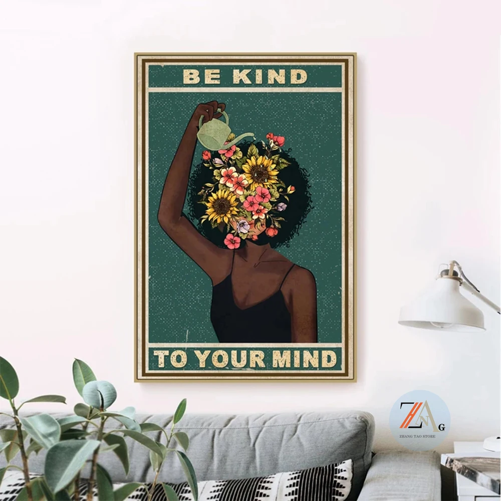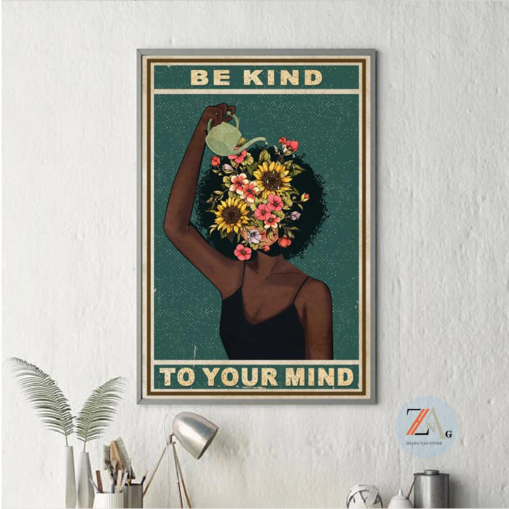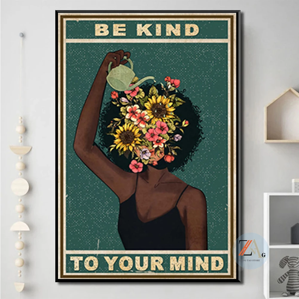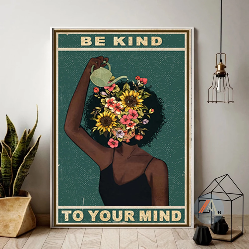 Черная девушка, умственное здоровье, плакат, будьте добры к вашему разуму, позитивные художественные принты, Африканская женщина, винтажная Картина на холсте, домашний декор