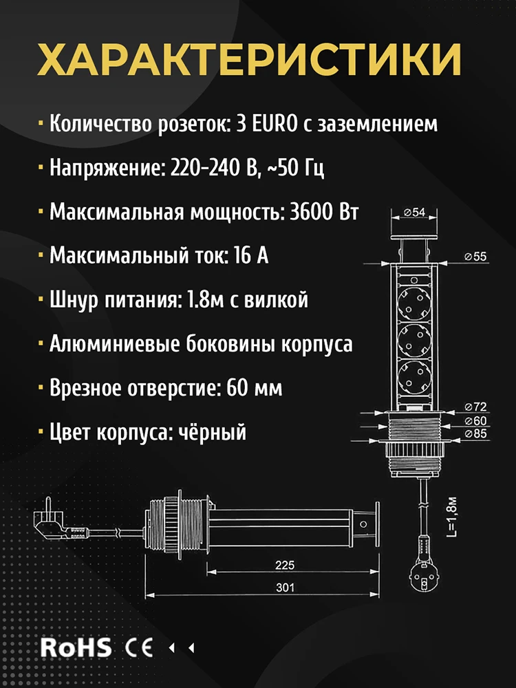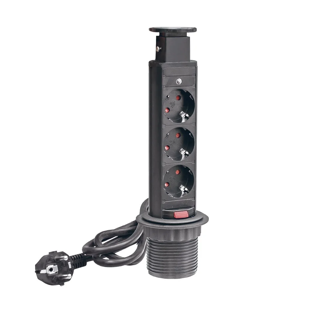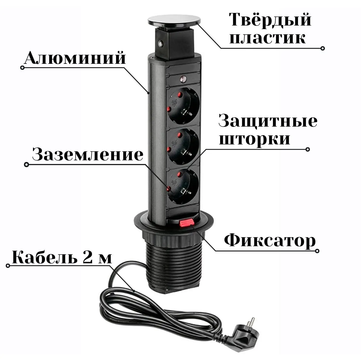 Выдвижная встраиваемая розетка, розеточный блок на 3 розетки, ETERSSO RUFH BLACK, провод 1,8м с вилкой, чёрный, вертикальный