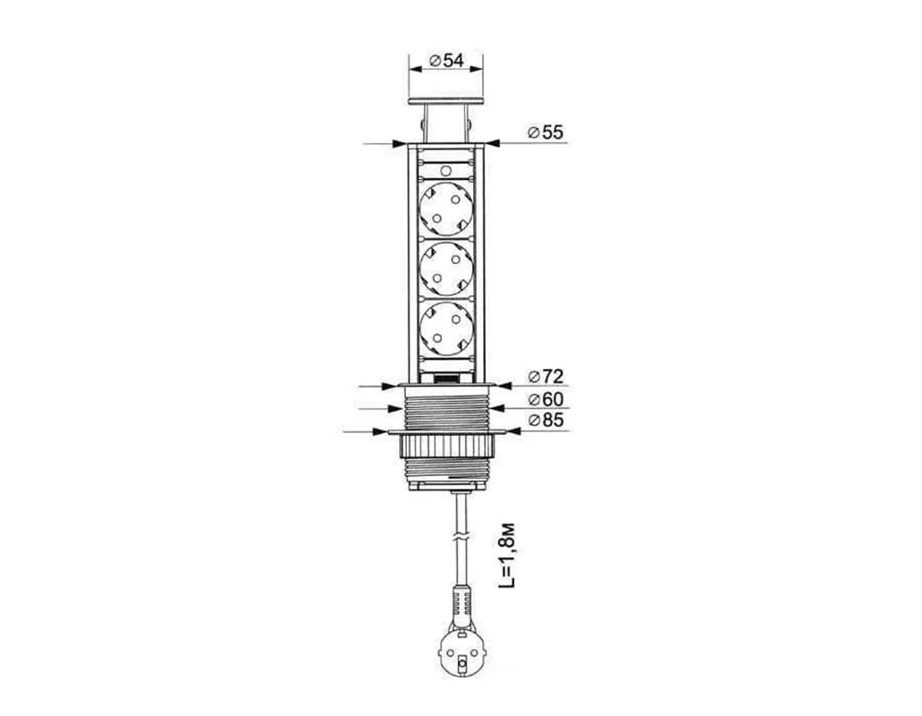 Розетка идет в комплекте с кабелем длиной 1,8 метра, с вилкой, сечение провода 3х1,5 мм.