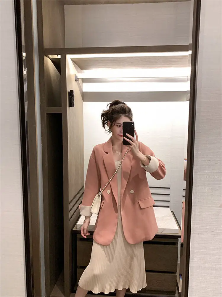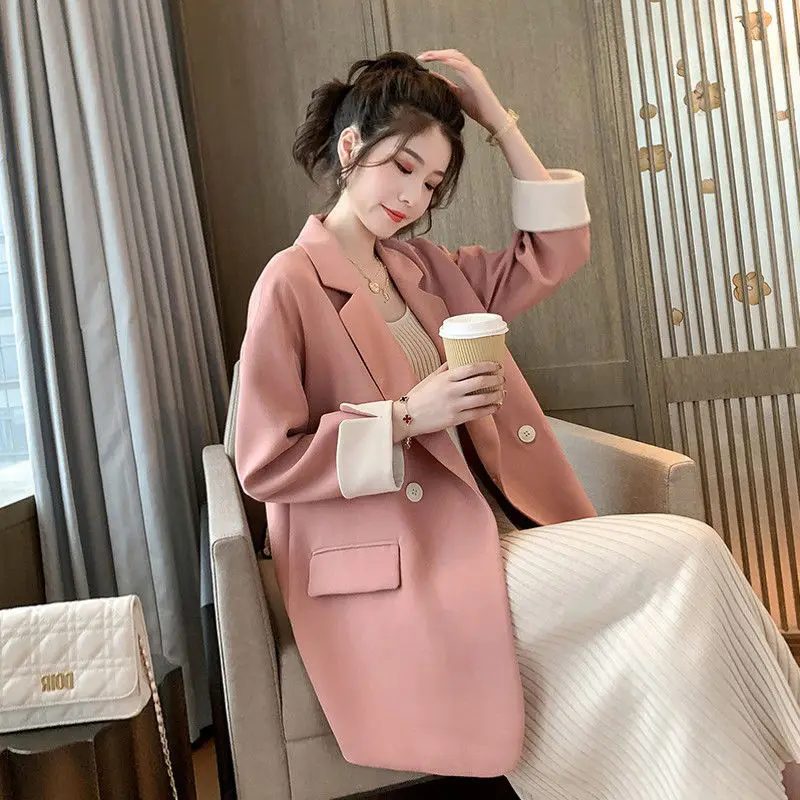 Пиджаки женские повседневные свободные элегантные офисные, простые Лоскутные двубортные модные уличные костюмы с разрезом в Корейском стиле