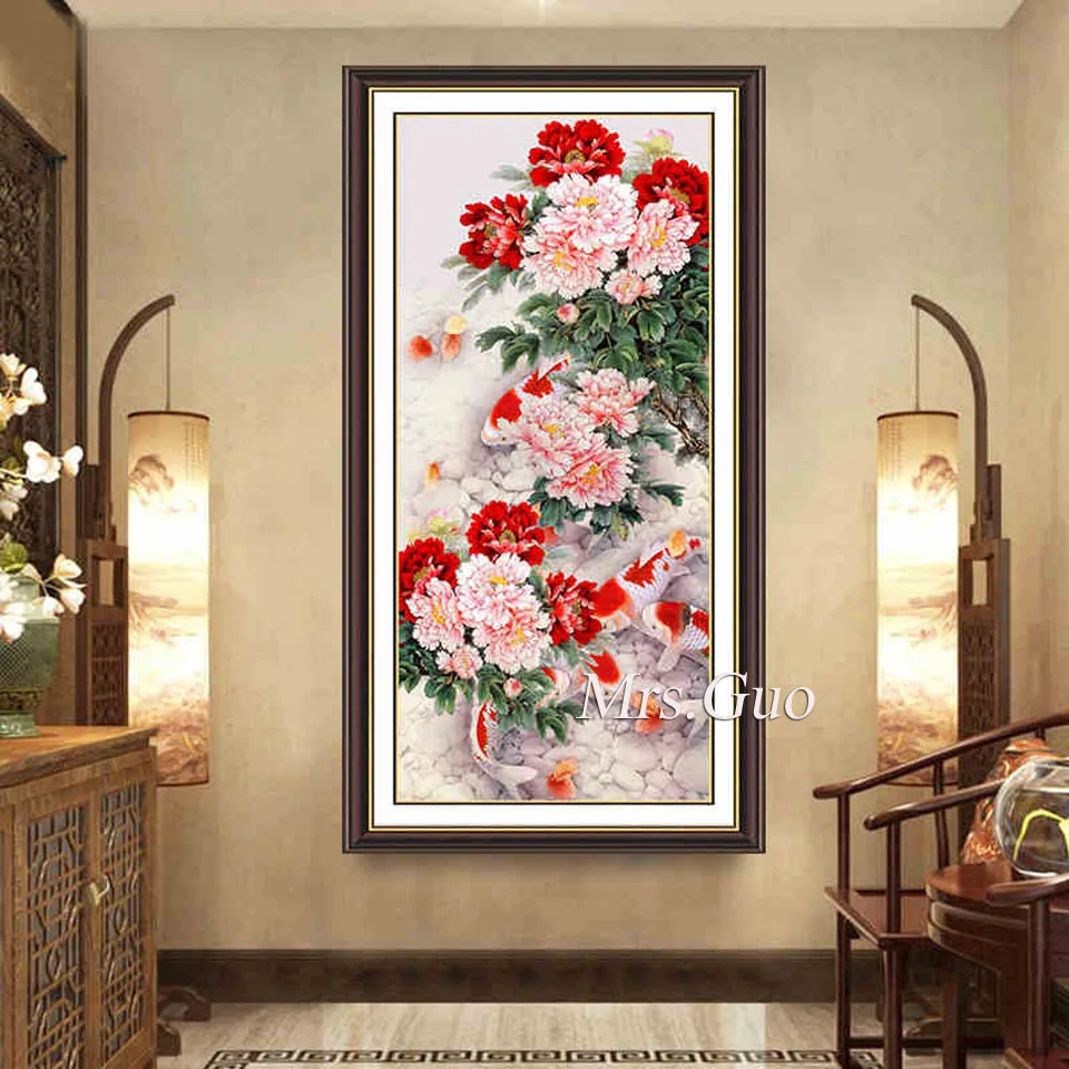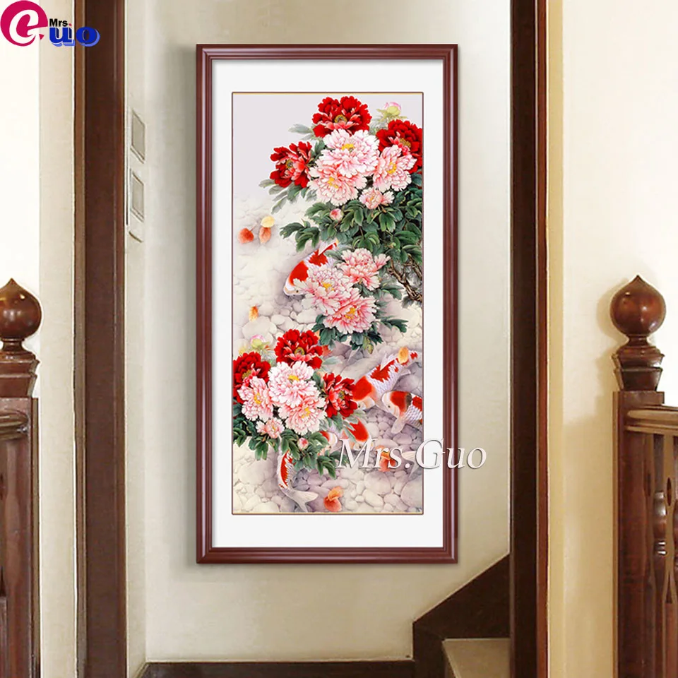 Алмазная живопись с пионами, вышивка крестиком, вертикальная версия, богатый цветок с девятью фигурками рыбок, 5d алмазная вышивка, домашний декор