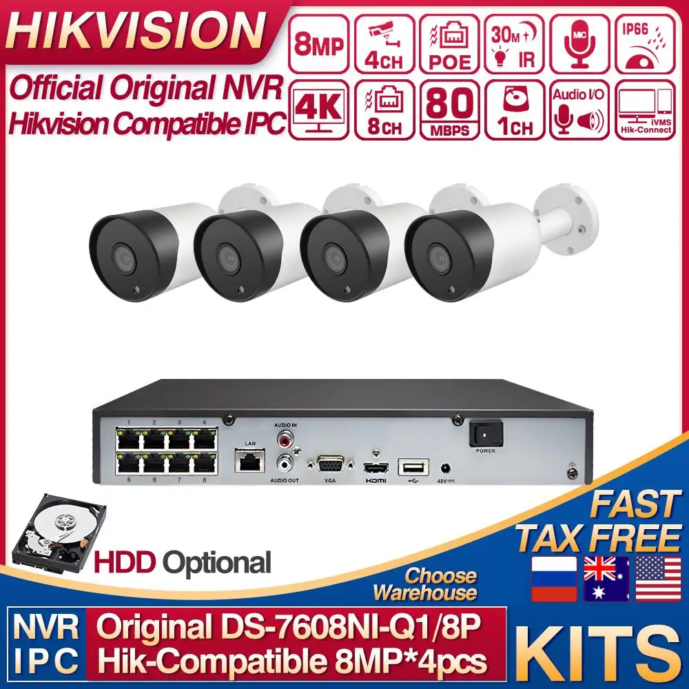 Hikvision совместимые наборы DS-7608NI-Q18P 8POE NVR и 4K IP-камеры Bullet POE 30M IR Встроенный микрофон 4 шт. 4K система видеонаблюдения умный дом