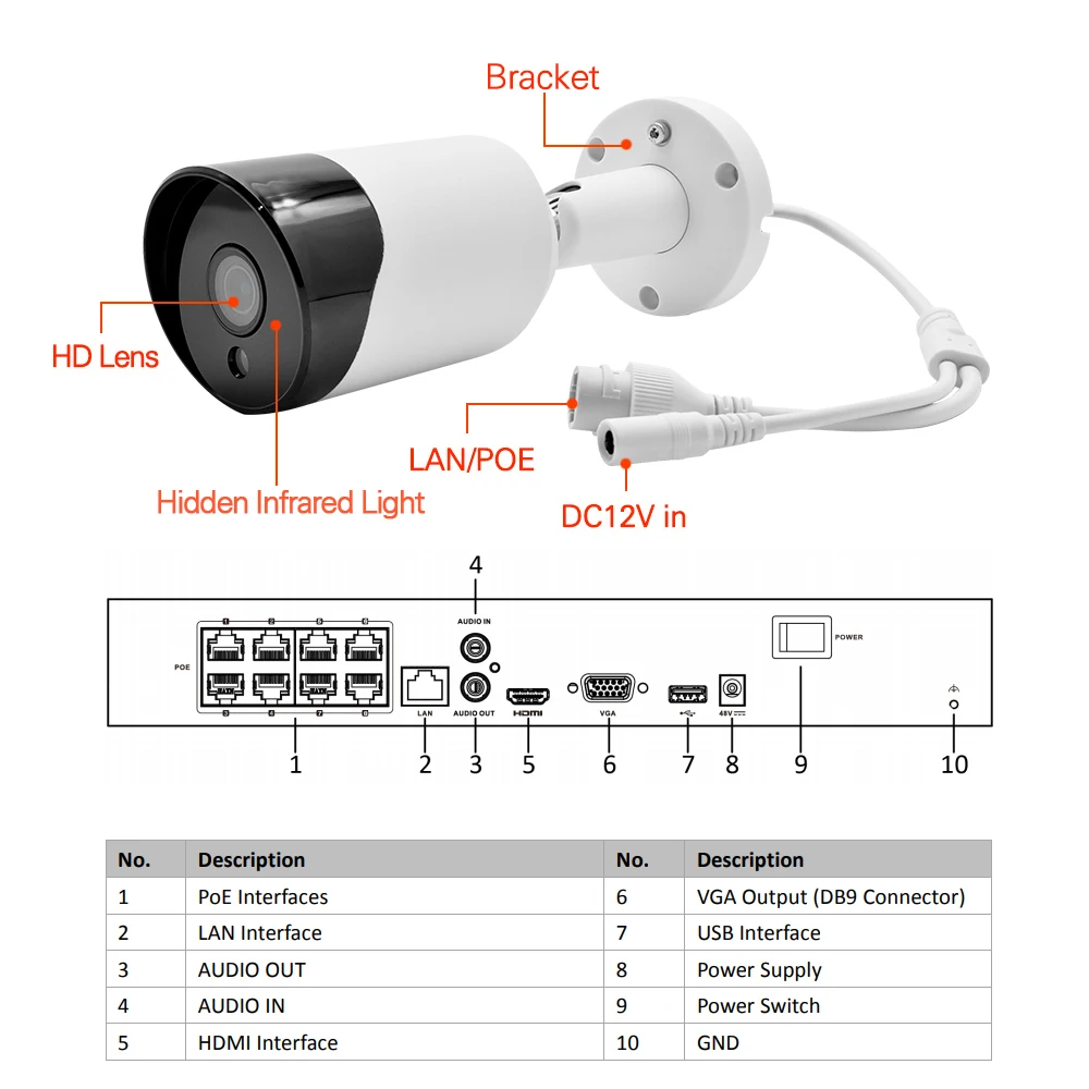 IPC:PG2085IHikvision compatible 8MP IP camera> Day/Night(ICR), Ultra DNR> Max. 20fps 8MP/25fps 6MP> H.265/H.264 dual-stream media server> Compatibility: HIKVISION,ONVIF,RTSP> Multi web browser, PC Client, mobile APP remote access> Support PoE> IP66waterproof> built-in MIC