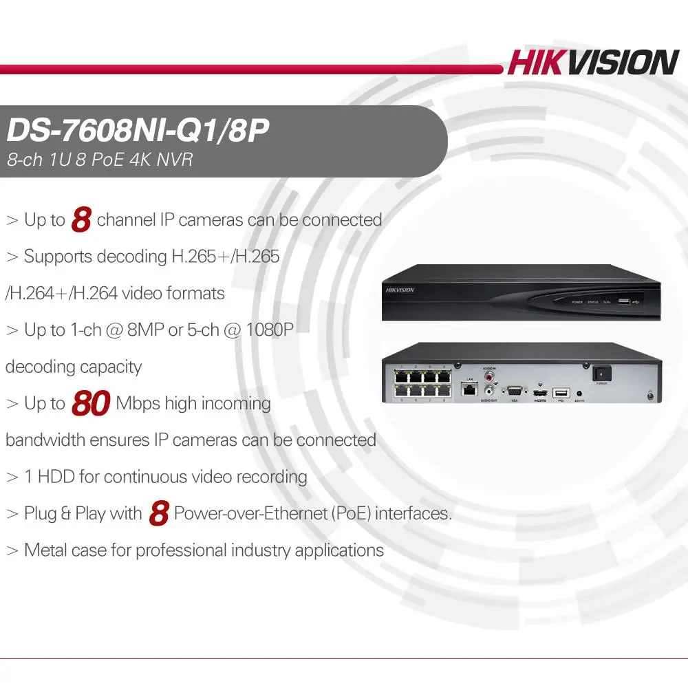 NVR:DS-7608NI-Q1/8P8-ch 1U 8 PoE 4K NVR> Up to 8 channel IP cameras can be connected> Supports decoding H.265+/H.265/H.264+/H.264 video formats> Up to 1-ch @ 8MP or 5-ch @ 1080P decoding capacity> Up to 80 Mbps high incoming bandwidth ensures IP cameras can be connected> 1 HDD for continuous video recording> Plug & Play with 8 Power-over-Ethernet (PoE) interfaces.> Metal case for professional industry applications
