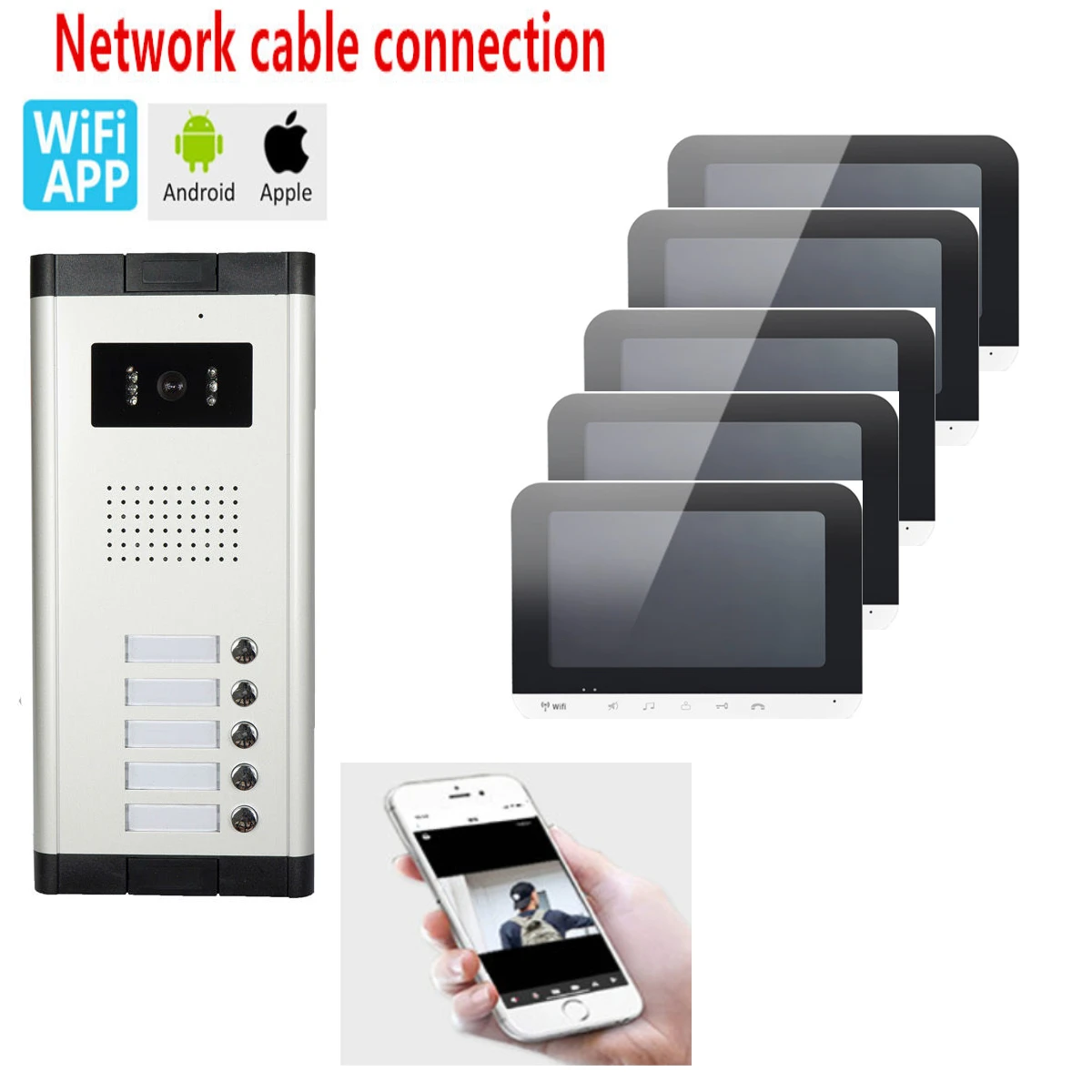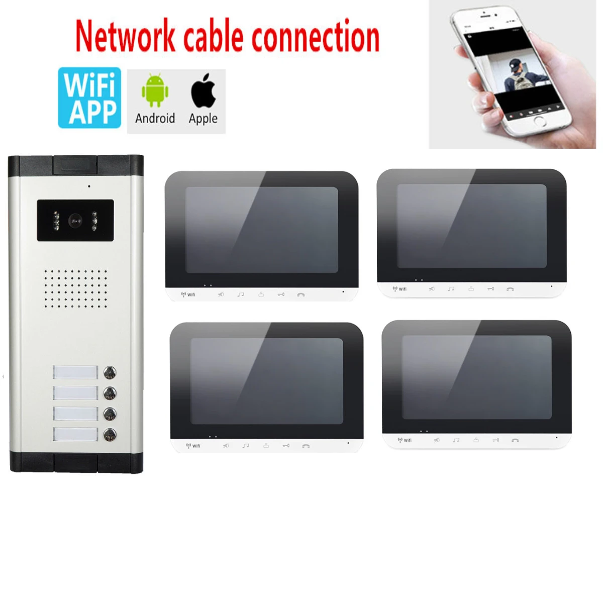 Простая установка самостоятельно с помощью адаптера и кабеля, которые мы предоставили в этом наборе, внешний блок может подключаться к внутреннему монитору с помощью проводного Кабеля 4P. Когда внутренний монитор подключен к вашему беспроводному Wi-Fi-роутеру, вы можете подключить мобильный телефон к внутреннему монитору, затем мобильный телефон также сможете записывать видео или открывать дверь и т. д. Широко используется для вилл, квартир, домов, отелей, Офисы, общественные здания и так далее.
