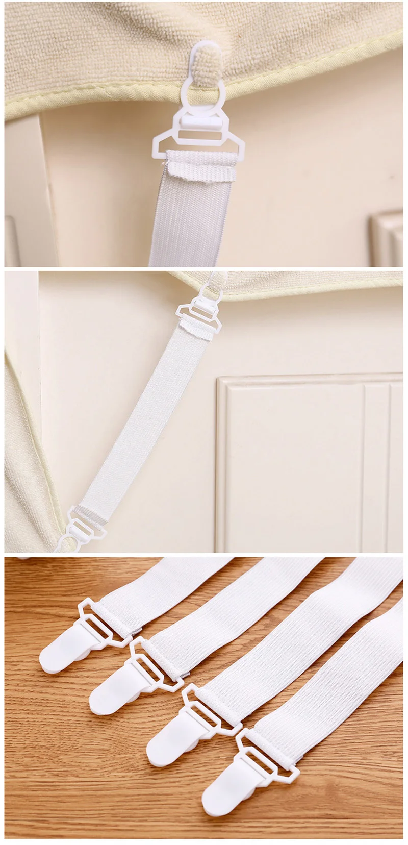 1. Изготовлен из высококачественного qНейлоновая эластичная веревка uality, плотно удерживает простыни. 2. Эластичный дизайн: легко захватить угол листа, чтобы сделать поверхность листа более ровной. 3. ЗащелкаКнопка позволяет контролировать нужное напряжение.4. Многофункциональное использование: подходит для гостиницы или домашней простыни, дивана, матраса и одеяла.