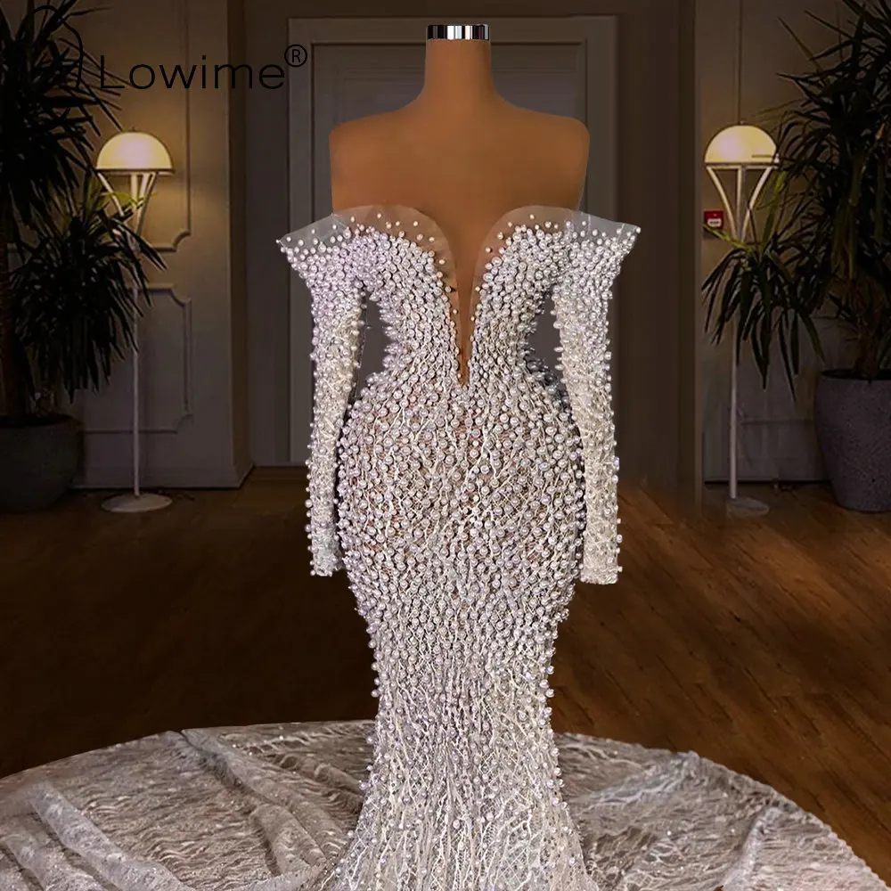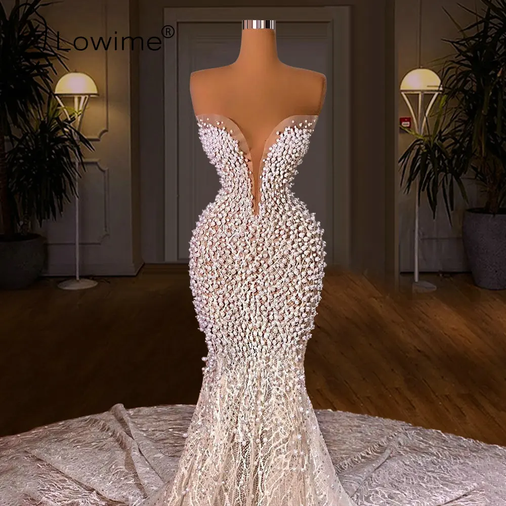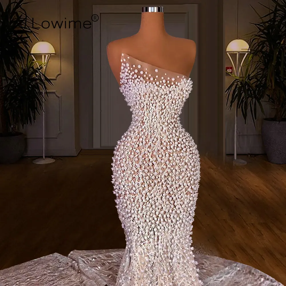 Вечернее платье-Русалка цвета слоновой кости, с длинным шлейфом, с жемчугом, из Дубая, для выпускного вечера, на заказ, 2021