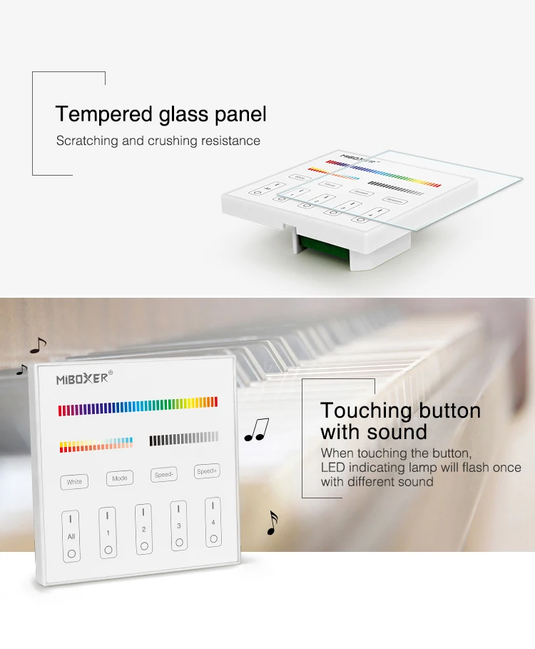 Название продукта: 4 зоны Яркость затемняя Смарт Панель пульт дистанционного управленияНомер модели:В1Рабочая температура: -20 ~ 60 ℃Напряжение: 3 в (2 * AAA батареи)(Аккумулятор в комплект не входит)Частота передачи: 2400-2483,5 МГцМетод модуляции: GFSKМощность передачи: 6 дБмРасстояние управления: 30 мМощность в режиме ожидания: 20uAРазмер панели: 86*86*19 ммНазвание продукта: 4-Зона CCT Регулировка Смарт ПанельНомер модели:В2Рабочая температура: -20 -60 ℃Напряжение: 3 в (2 * AAA батареи)(Аккумулятор в комплект не входит)Частота передачи: 2400-2483,5 МГцМетод модуляции: GFSKМощность передачи: 6 дБмРасстояние управления: 30 мМощность в режиме ожидания: 20uAРазмер панели: 86*86*19 ммНазвание продукта: 4-зона, RGBW смарт Панель пульт дистанционного управленияНомер модели:В3Рабочая температура: -20 -60 ℃Напряжение: 3 в (2 * AAA батареи)(Аккумулятор в комплект не входит)Частота передачи: 2400-2483,5 МГцМетод модуляции: GFSKМощность передачи: 6 дБмРасстояние управления: 30 мМощность в режиме ожидания: 20uAРазмер панели: 86*86*19 ммНазвание продукта: 4 зоны RGB + CCT Smart Панель пульт дистанционного управленияНомер модели:В4Рабочая температура: -20 -60 ℃Напряжение: 3 в (2 * AAA батареи)(Аккумулятор в комплект не входит)Частота передачи: 2400-2483,5 МГцМетод модуляции: GFSKМощность передачи: 6 дБмРасстояние управления: 30 мМощность в режиме ожидания: 20uAРазмер панели: 86*86*19 ммB1 / B2 / B3 / B4/B4-Размер