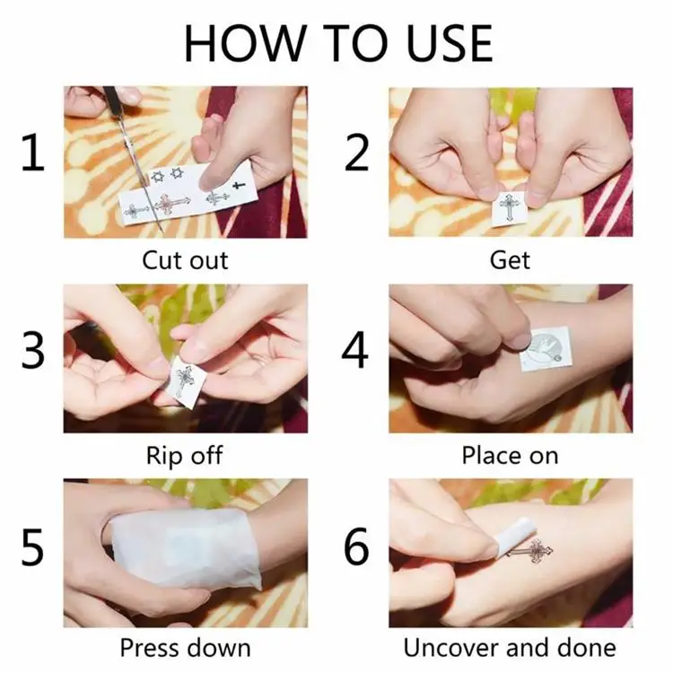 Руководство пользователя:1. Вырежьте татуировку fo choce и прозрачный лист.2. Нанесите татуировку на кожу3. Намочите тату с помощью губки4. Через 20-30 секунд Аккуратно удалите подложку5. Позвольте татуировке высохнуть