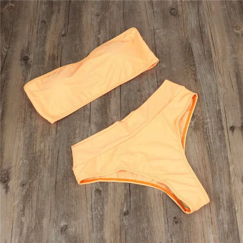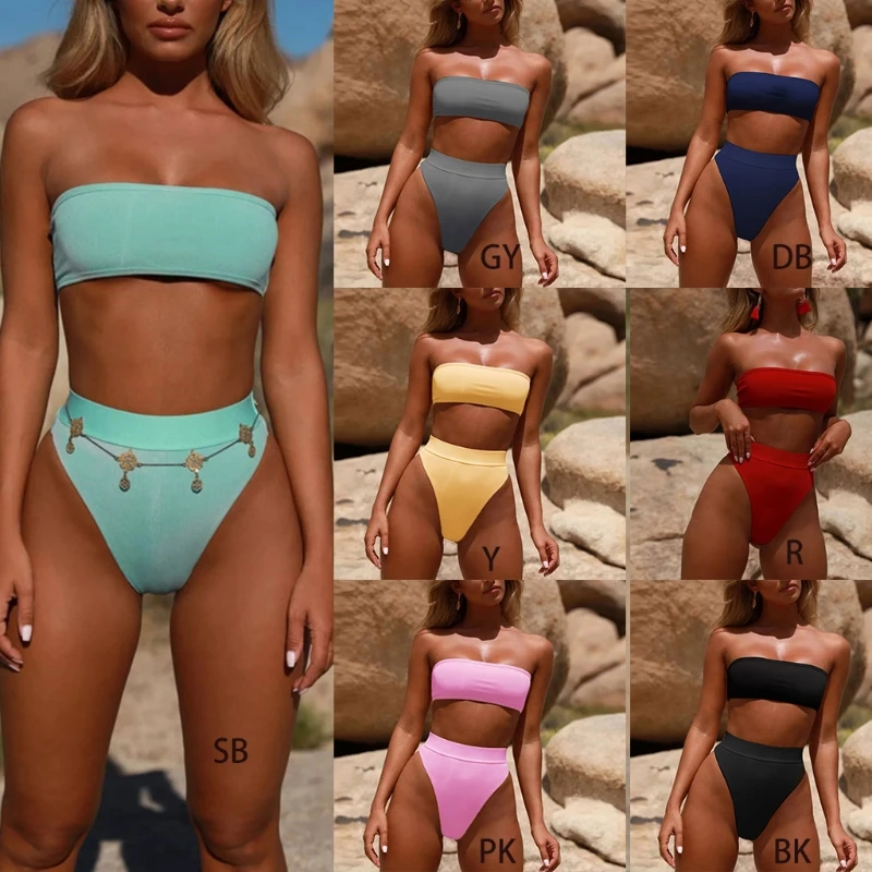 Женский сексуальный комплект бикини из 2 предметов, без бретелек, съемная подушечка, купальник с высокой талией, однотонный купальный костюм